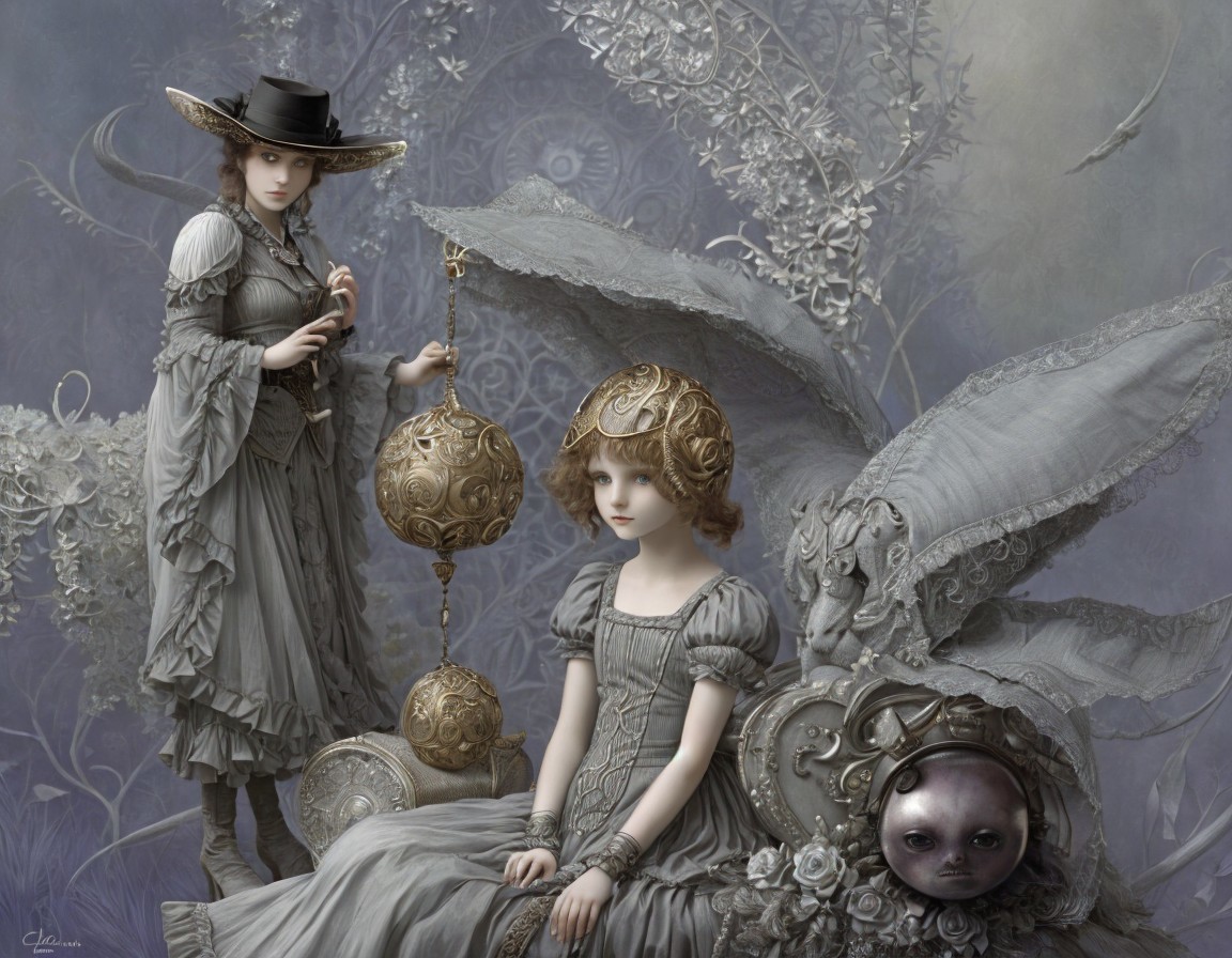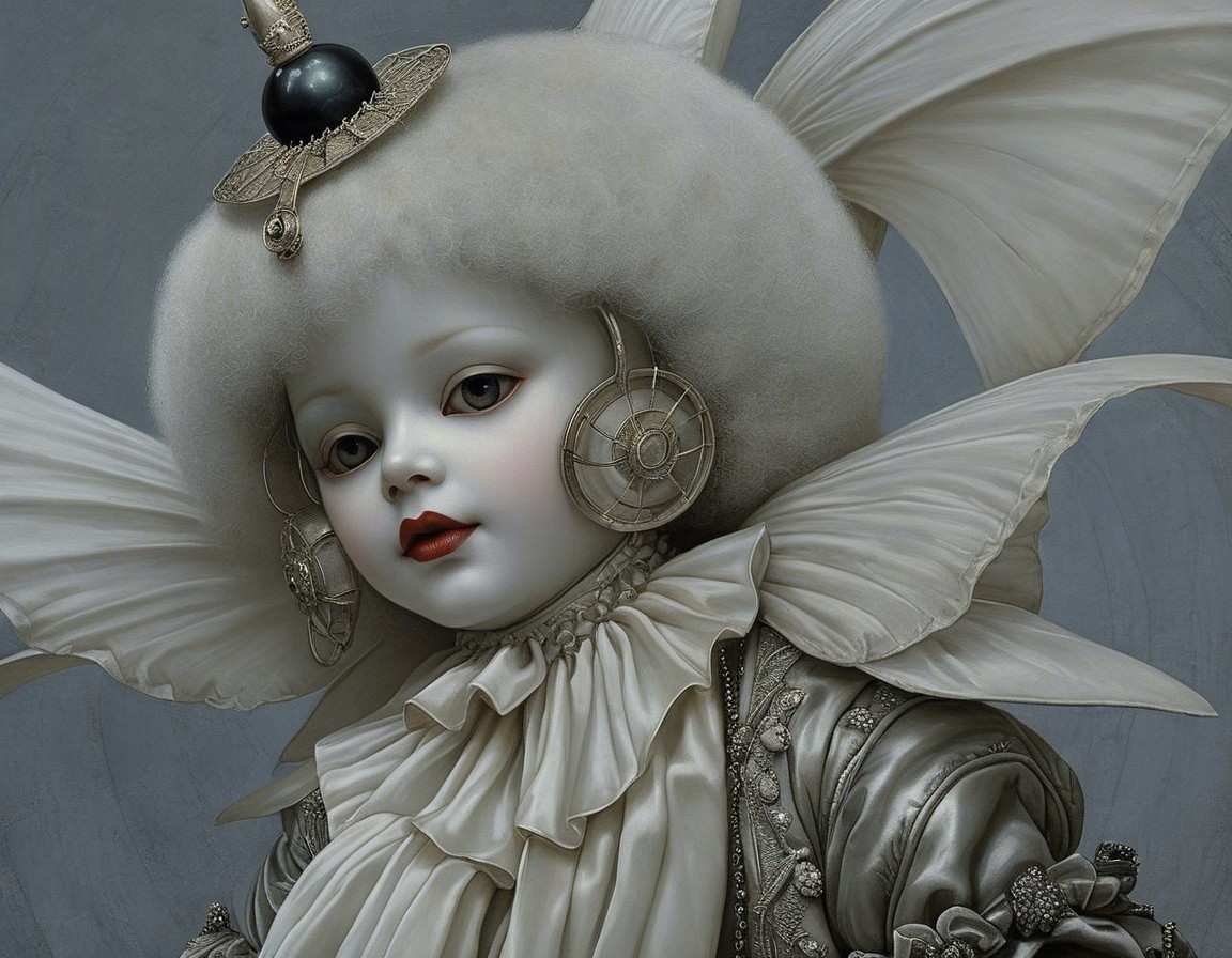 A delicate, porcelain-skinned figure in a regal costume features a dramatic white ruff and an ornate headpiece, exuding an air of elegance and mystery against a soft, muted background.
