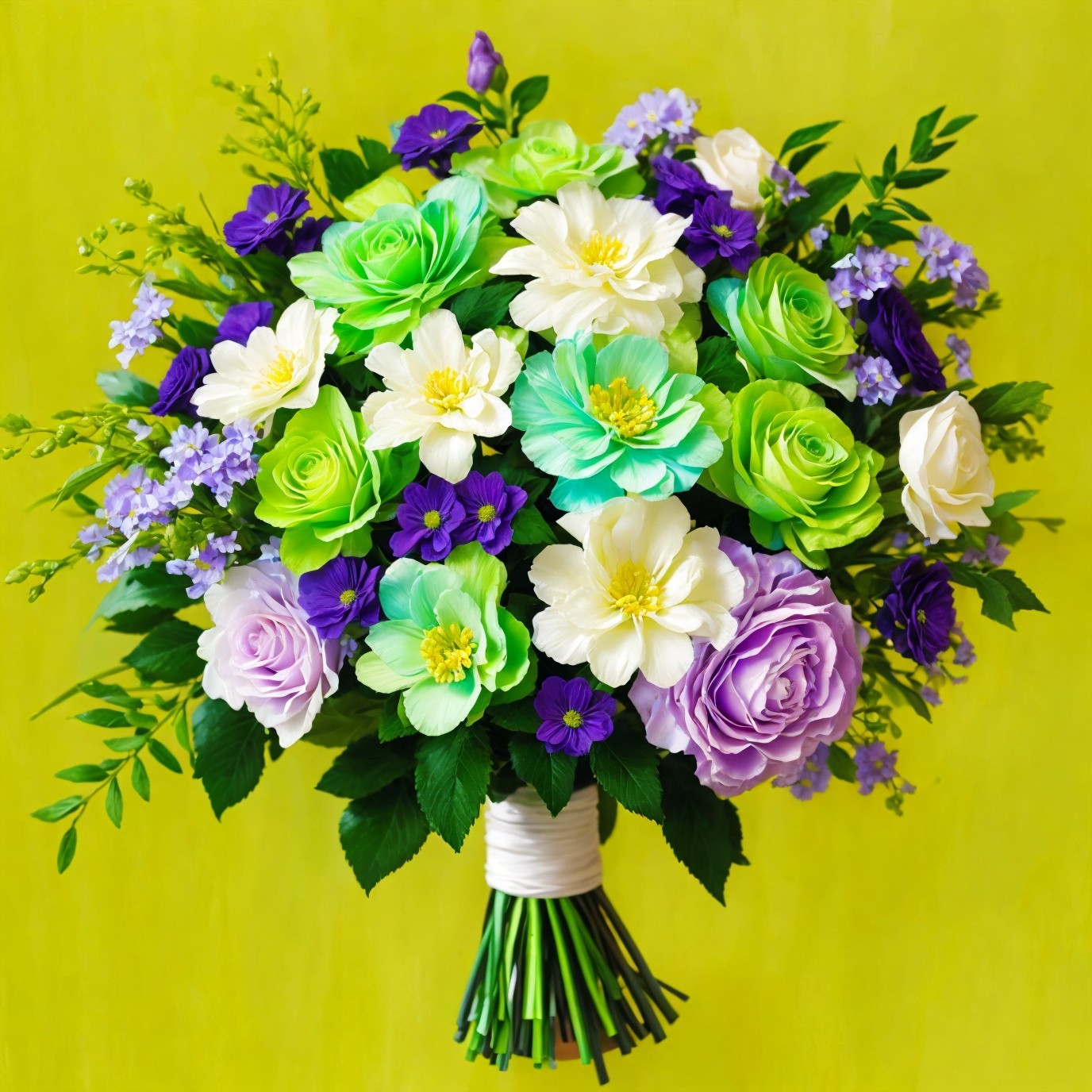 A vibrant bouquet of white, green, and purple flowers against a yellow background.