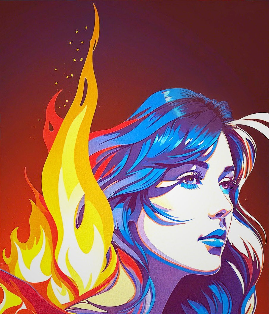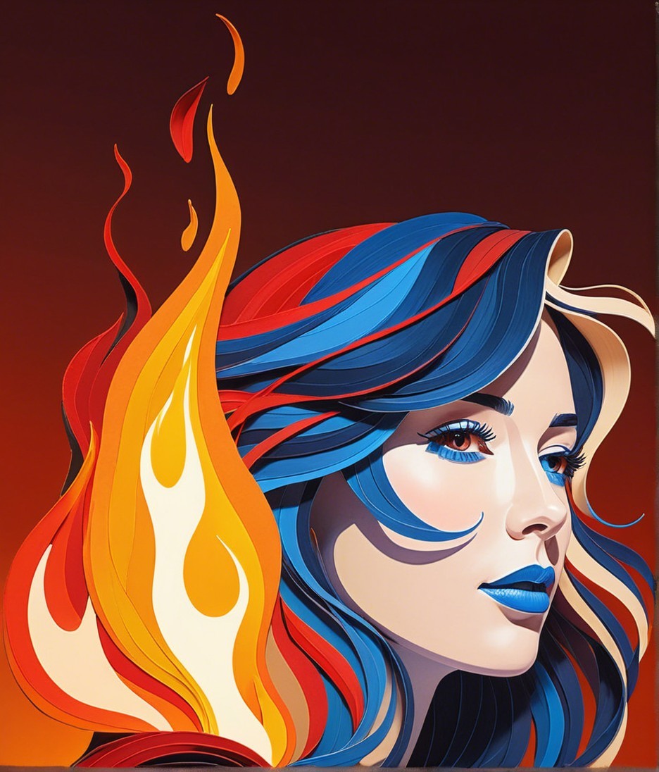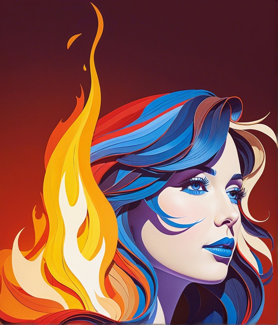 + Prompt:Gouache portrait, side view, stylized, stippled, tesselated, 3d effects 1.8, anisotropic filtering 1.7, brightened dynamic lighting 1.7, colored line drawing, simplistic, female diva emerging from fire, entangled in flowing flames, ethereal, triadic color scheme beige blue red, plasticity 1.6, luminosity 1.3, radiance and dynamic lighting 1.7 from top,sculpted, retrofuturistic, divisionism, quilling fantasy movie still by Georgia O'Keeffe and Didier Lourenço, Streamline_Moderne merged with academical art, hues, close-up, headshot, detailed brushed textures, visible brushwork, gradient inking colors, intricate hues, schregerlines 1.3, auracore 1.7, dimmed background, crisp quality, octane render illustration 1.5, subtle, uhd, hdr, parallax occlusion 1.6, groovy, grunge, high contrasting colors, tween, muscular, anatomically correct facial features, highly dramatic,
