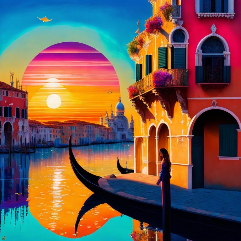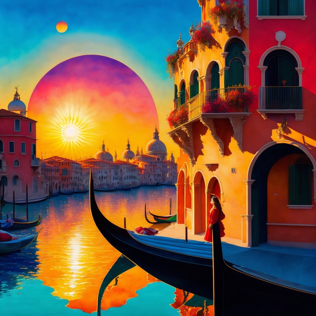 Prompt: Full page, single image, spectacular high-definition page-width sun, rising in very smoothly graduated red to gold colors, over Venice, 3D watercolor patchwork, gondolas, satiny, high quality, shimmering, vibrant saturated colors, elegant, highly detailed, glistening magic style, by Dee Nickerson with elements of the style of Alphonse Mucha, with elements of Tingatinga style and Gustav Klimt style