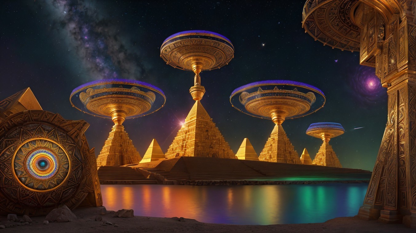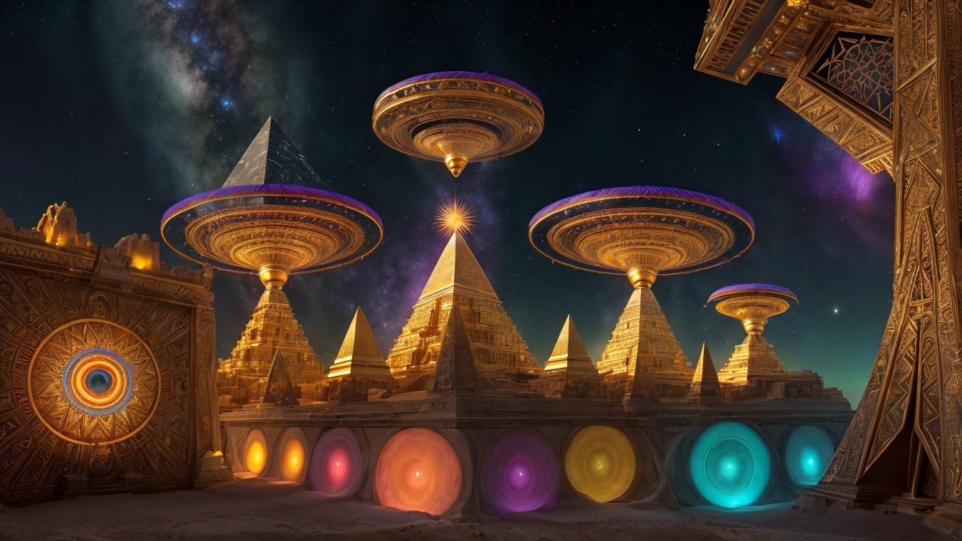 A fantastical scene with pyramids and hovering UFOs under a starry night sky, featuring ancient architecture and ethereal lights.