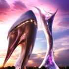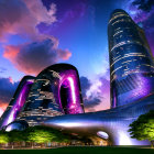 A stunning architectural marvel towers against a vibrant sky, featuring futuristic curves and glowing lights. The building’s sleek design contrasts beautifully with the colorful clouds above.