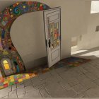 A vibrant, abstract boat sculpture featuring colorful patterns and a distinctive crescent shape. It's displayed in a modern, spacious interior with light-colored flooring.