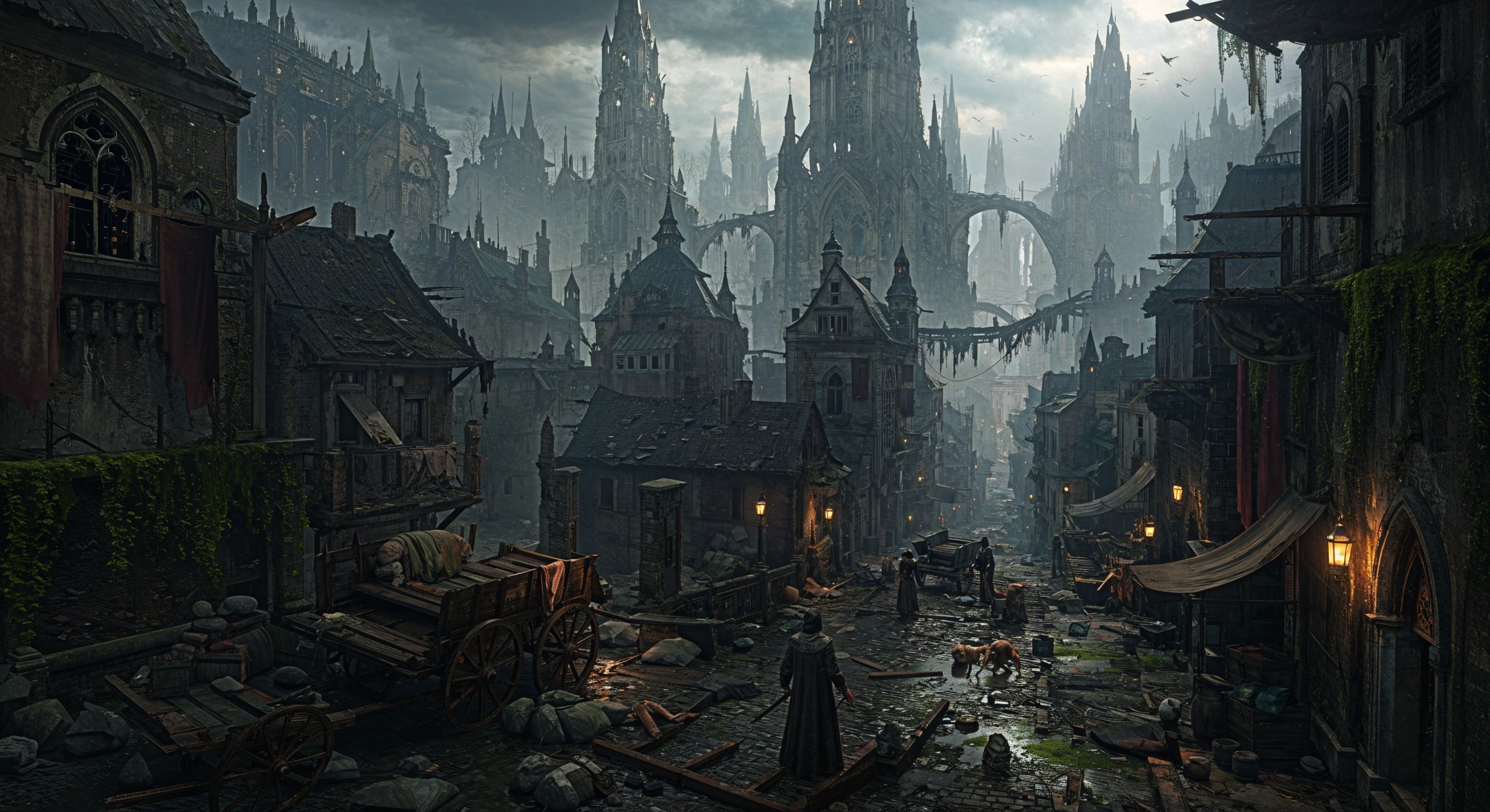 A dark, atmospheric medieval town, shrouded in mist and shadow. Weathered buildings tower above cobblestone streets, with a lone figure cloaked in black amidst eerie, Gothic architecture.