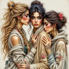 Three women with varying hairstyles stand close together, exuding warmth and connection. Their soft, casual attire and gentle expressions create an intimate, serene atmosphere.