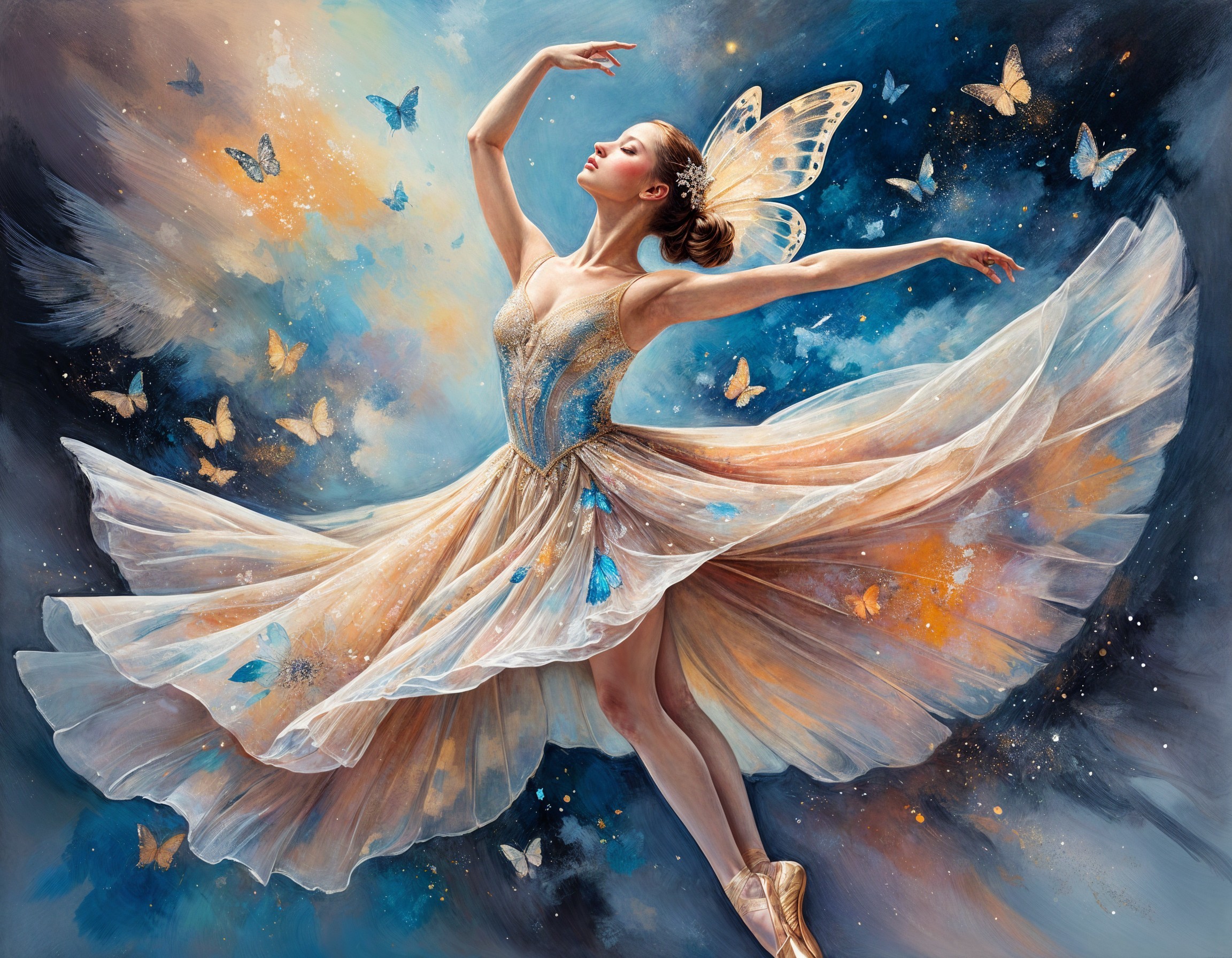 A graceful ballerina dances in a flowing, ethereal dress, adorned with butterfly wings. Butterflies flutter around her against a dreamy, starry sky backdrop, creating a magical scene.