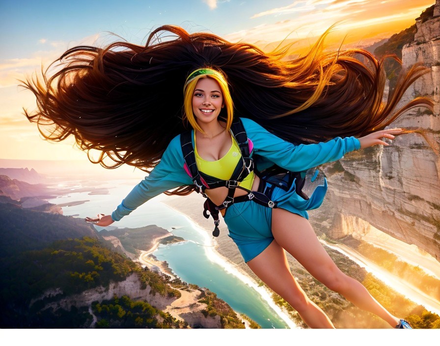 A woman with long flowing hair bungee jumping over a scenic gorge with a river below. She wears sportswear and sneakers, smiling mid-air.