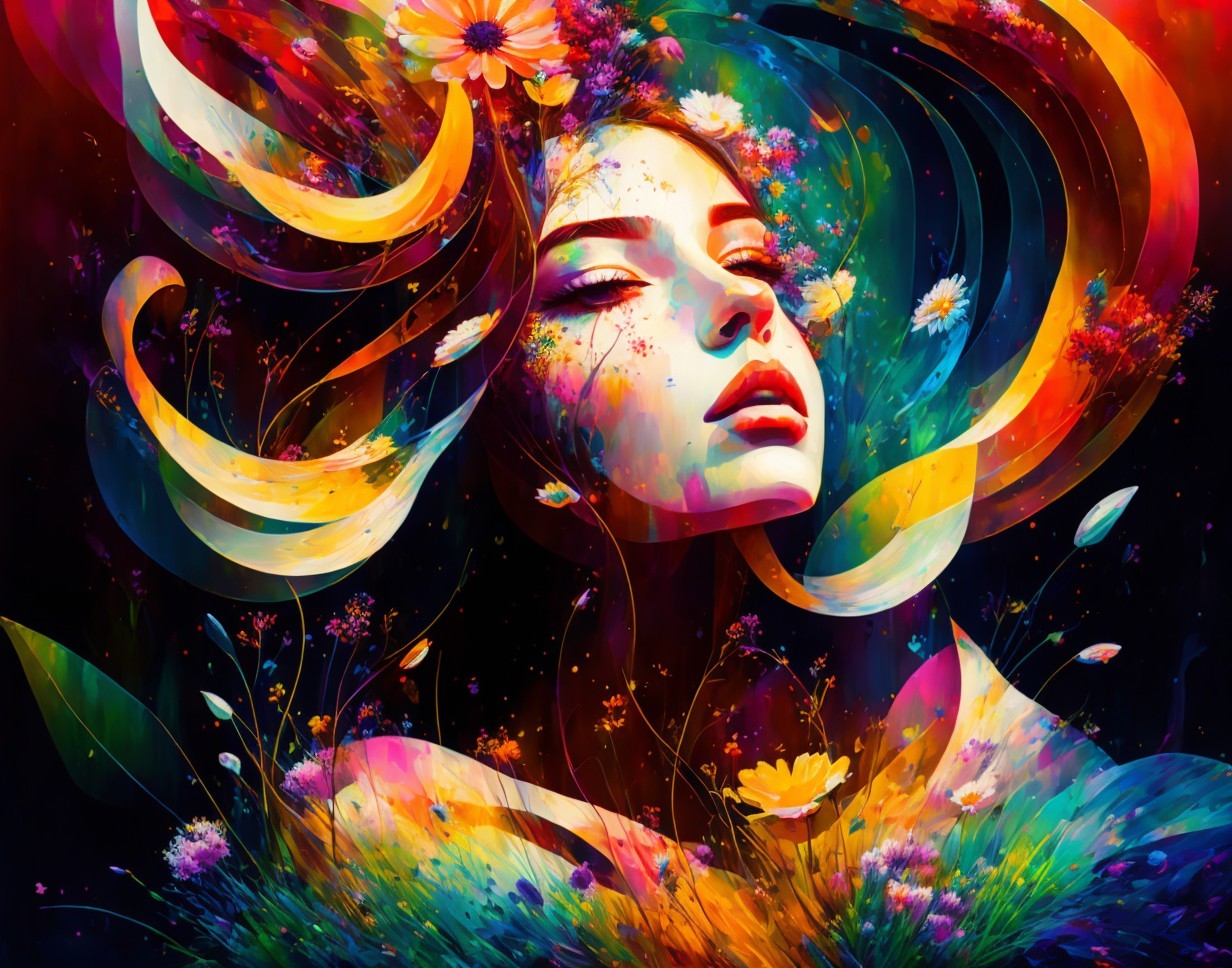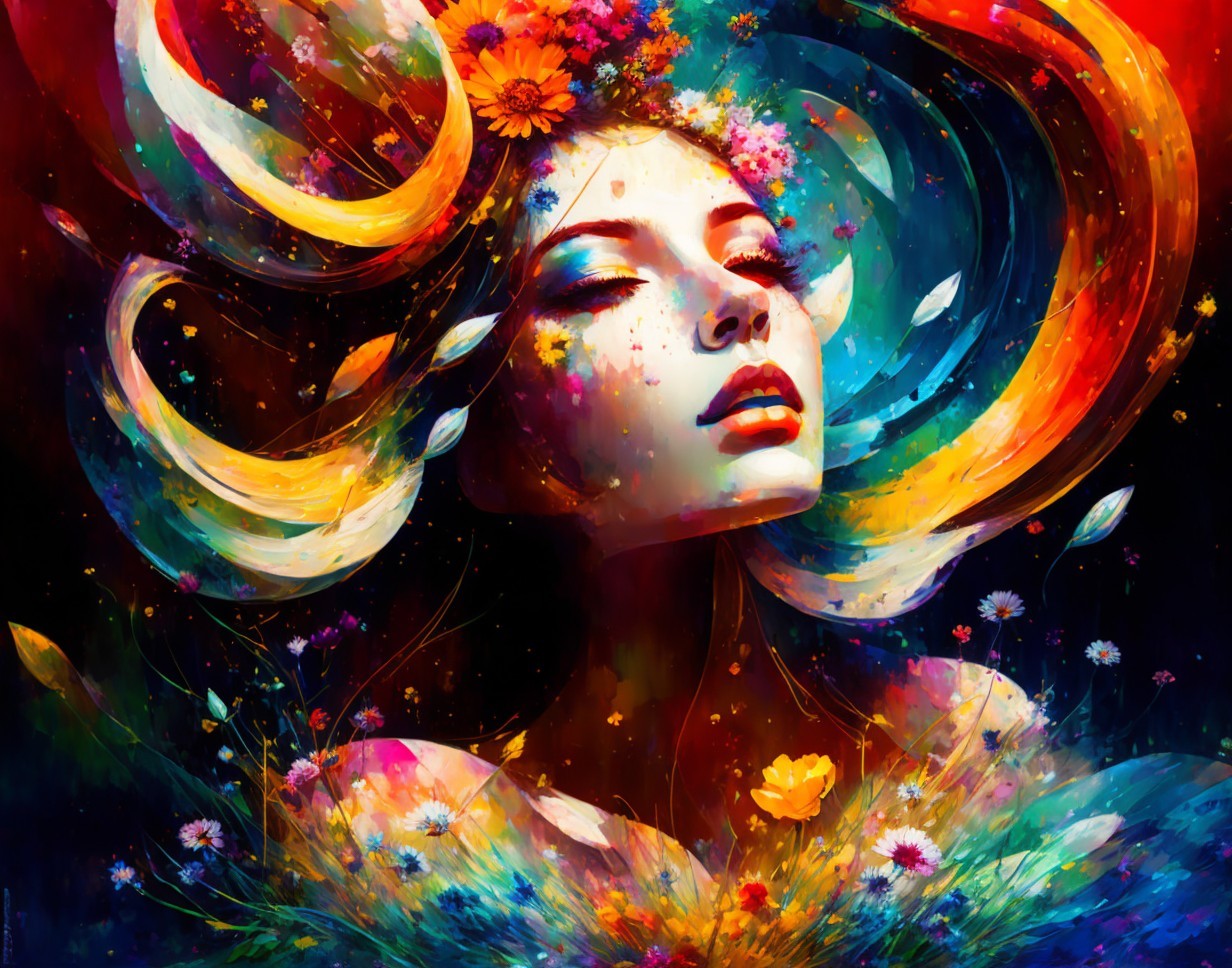 A vibrant digital artwork of a woman with swirling hair in a colorful, floral universe, blending nature with a dreamlike fantasy.