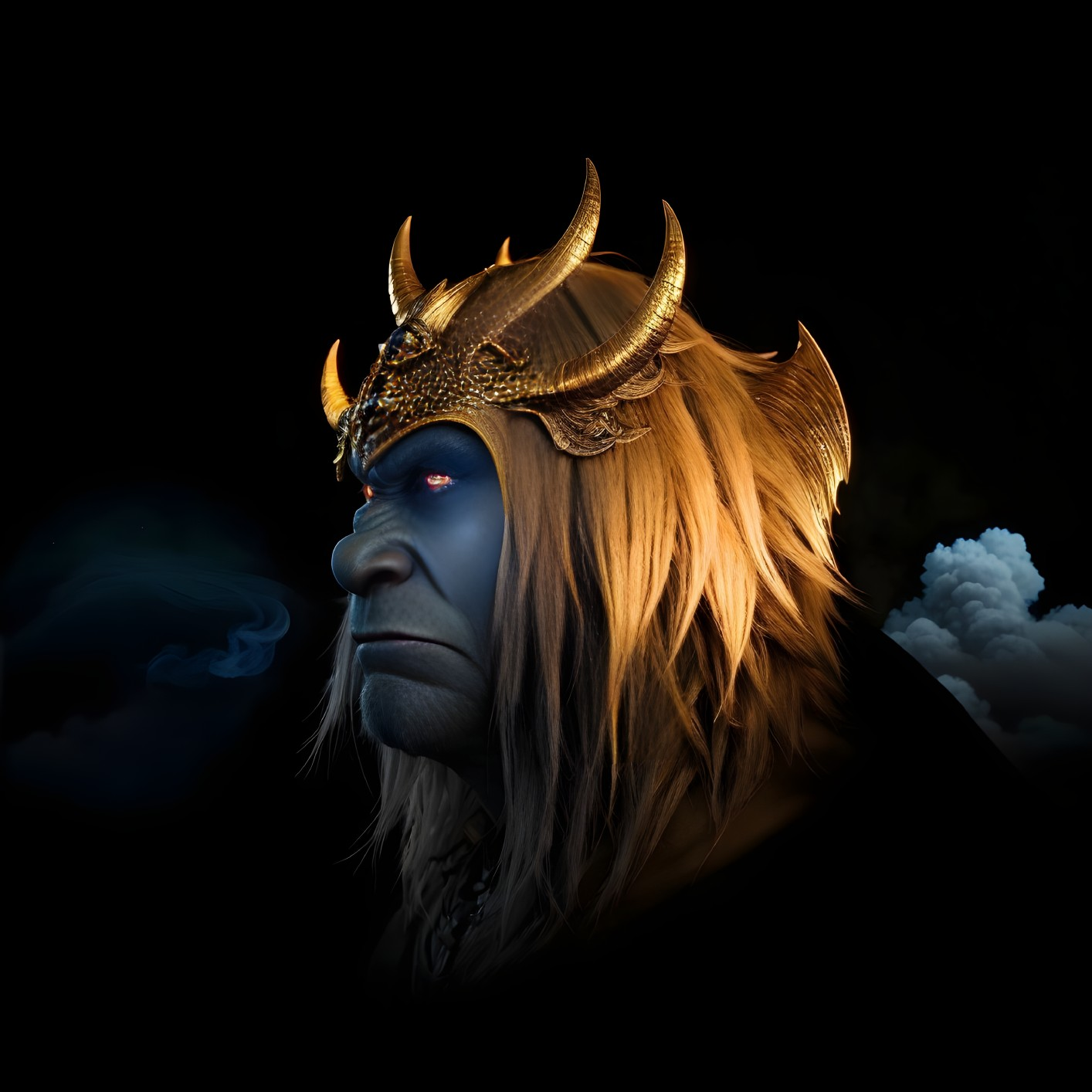 A mystical figure with blue face paint, glowing red eyes, and a golden horned helmet emerges from darkness, with clouds and a subtle blue mist. Text by AI, image by constance lowery.