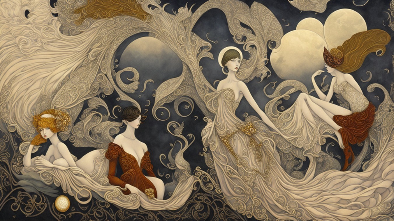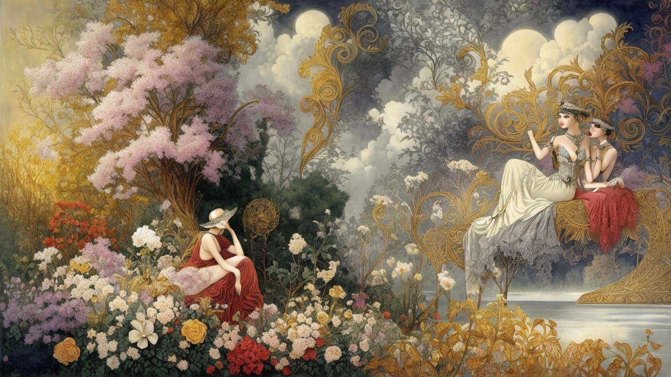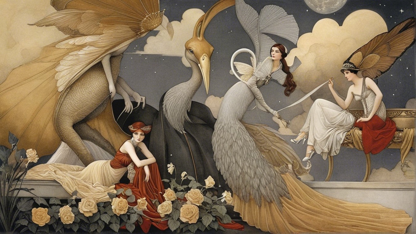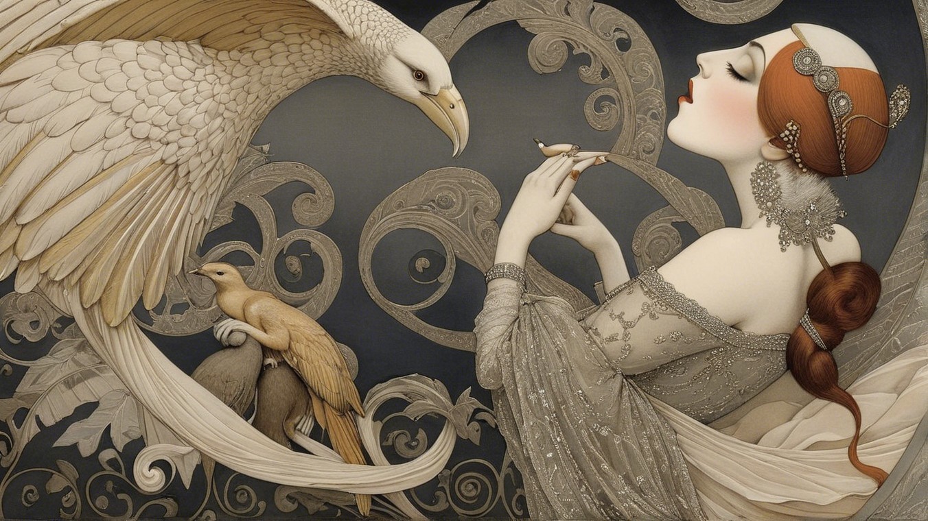 The artwork features an elegant woman with wavy red hair and a silver gown, gracefully interacting with a swan. The scene exudes a vintage, Art Deco vibe with soft colors and intricate details.