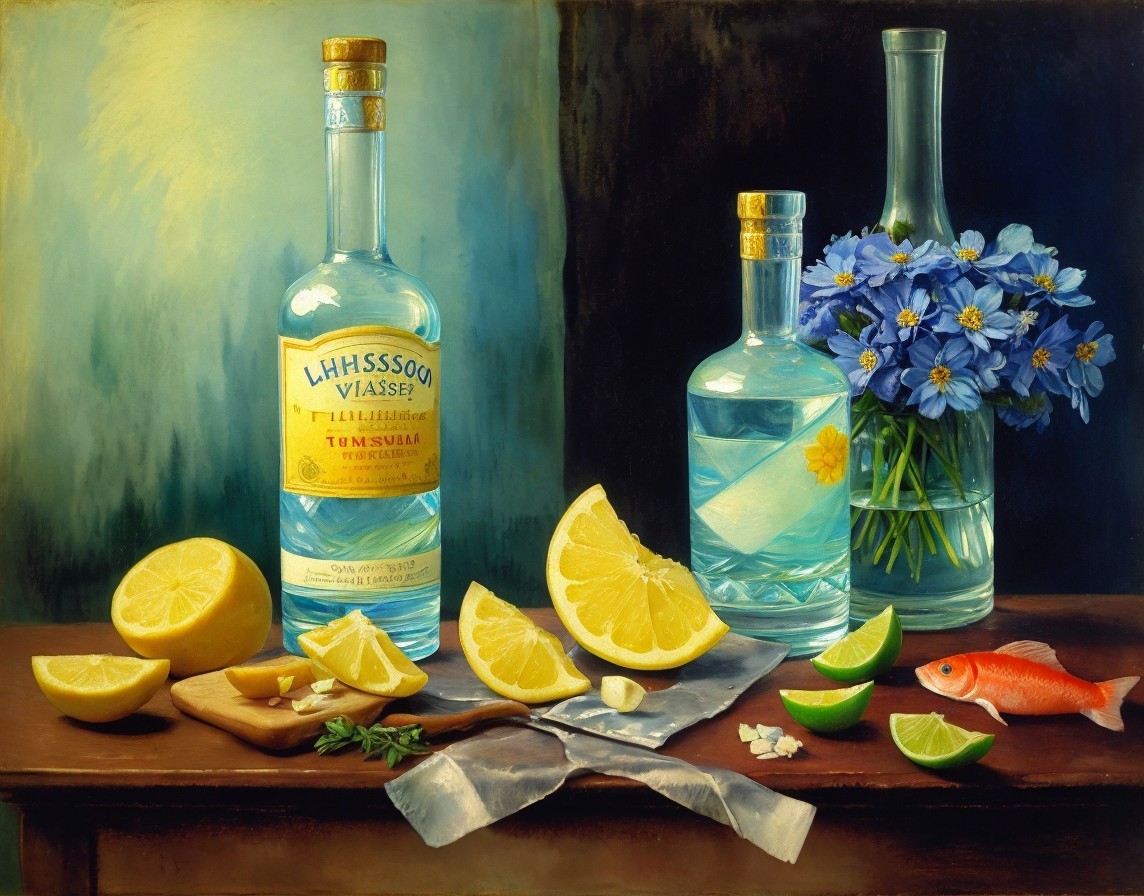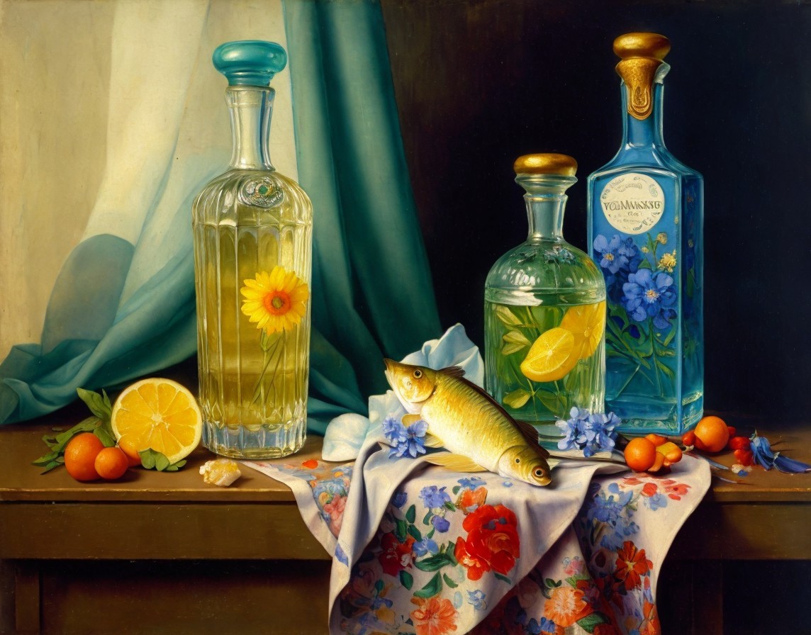 A still-life painting with glass bottles, blue flowers, lemon slices, a nut, and candies on a draped table under soft light.