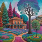 A vibrant, colorful landscape features a quaint house with a red roof, surrounded by tall, stylized trees and rolling hills, creating a cheerful and inviting scene.