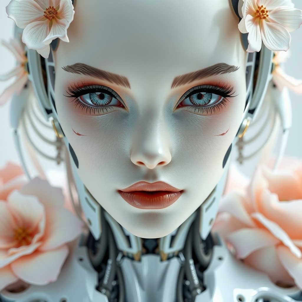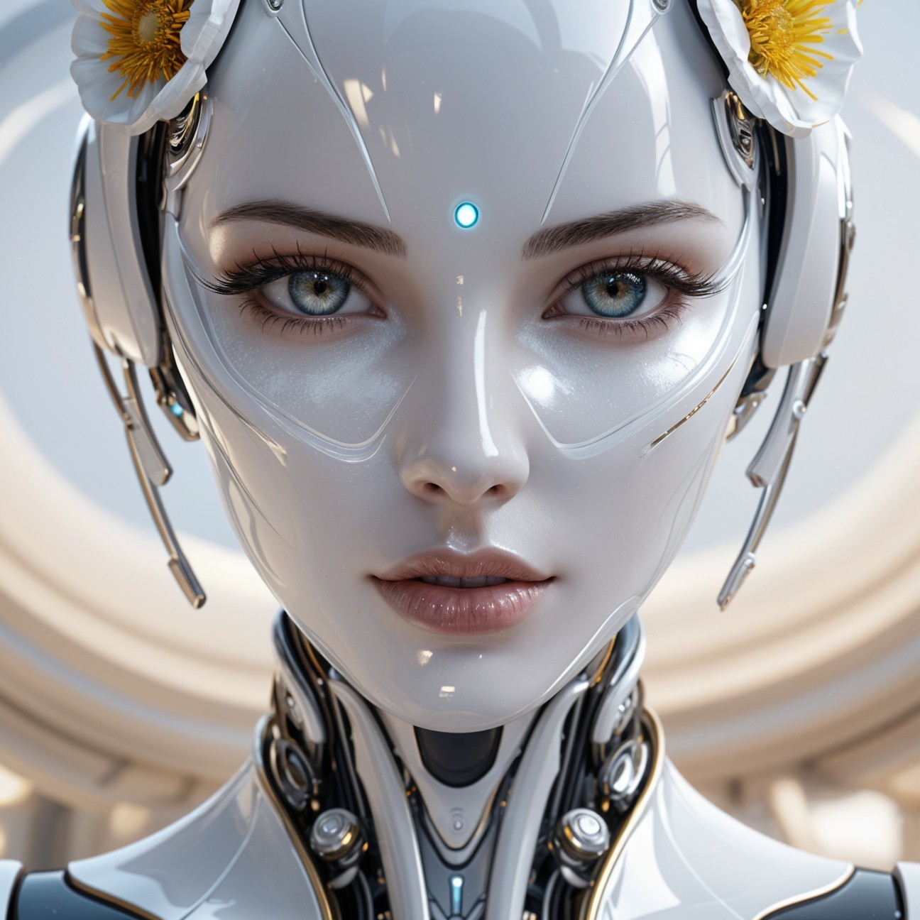 A hyper-realistic female android with a serene expression, detailed blue eyes, adorned with a headpiece and futuristic attire.