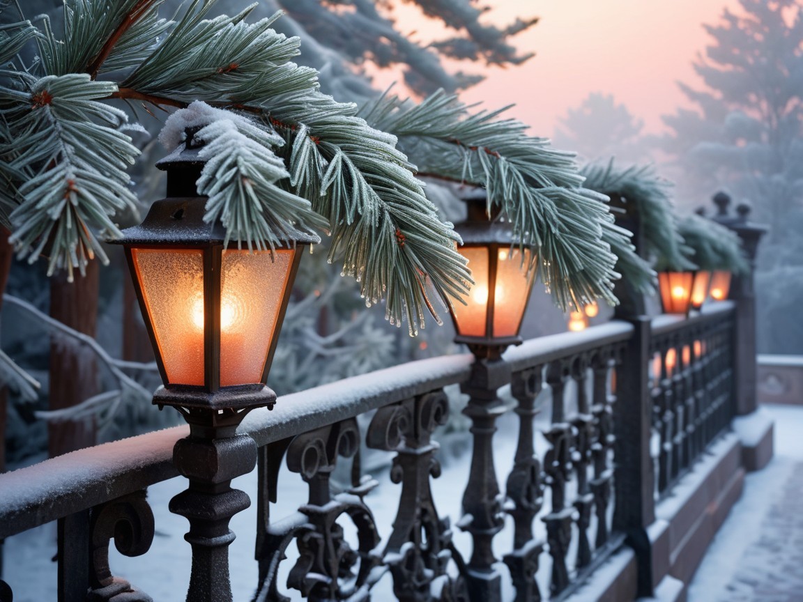 A beautiful nighttime winter scene of snow-covered pine boughs resting on the top of an ornate black railing with several illuminated lanterns, with the glow of orange light on the snow from the lanterns. The lanterns are casting a warm yellow light, while the sky has a pinkish-orange hue, all