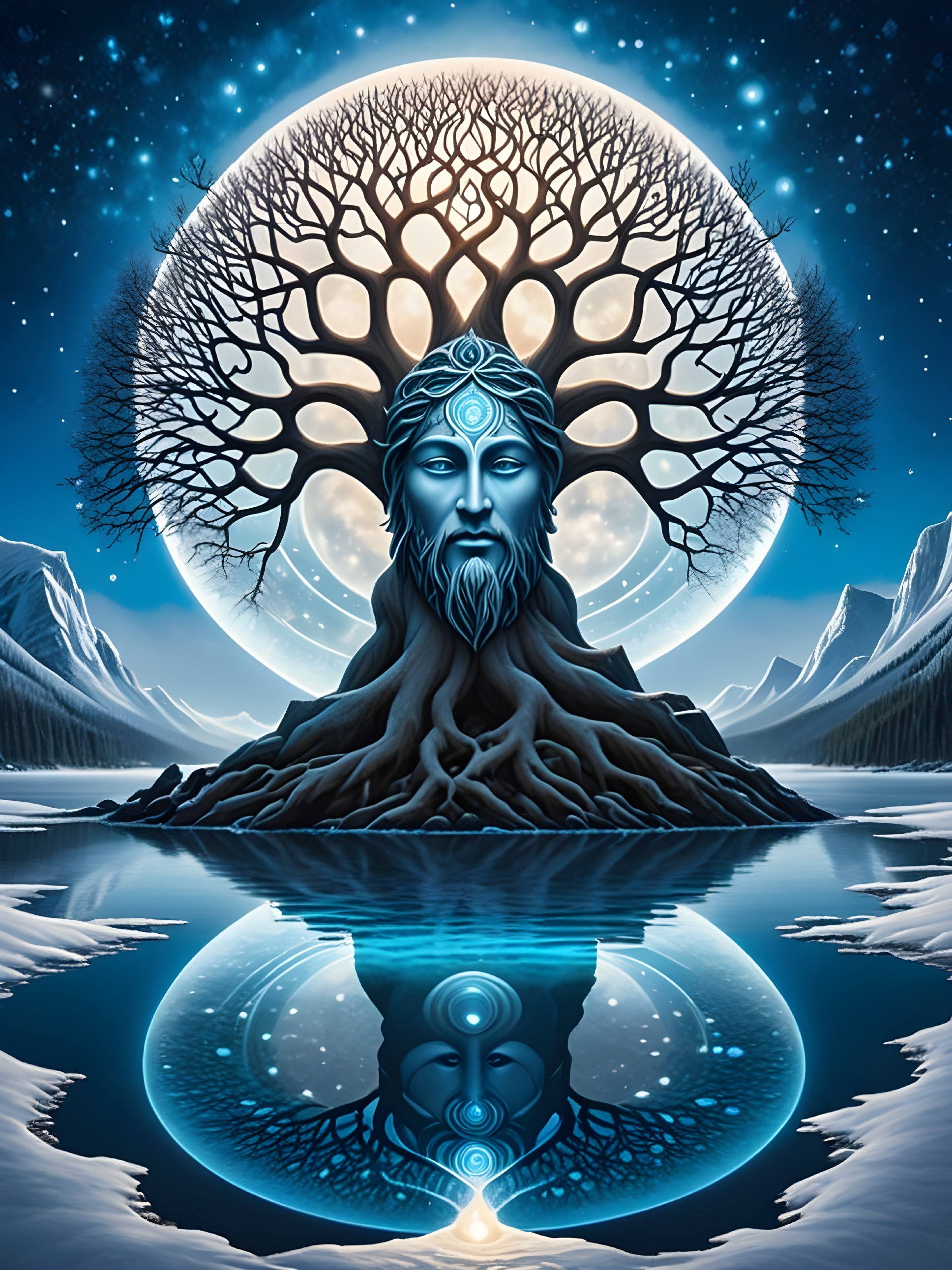 A mystical scene features a serene tree of life with a human face, its roots reflecting in a tranquil lake under a glowing full moon, surrounded by snowy mountains and a starry night sky.