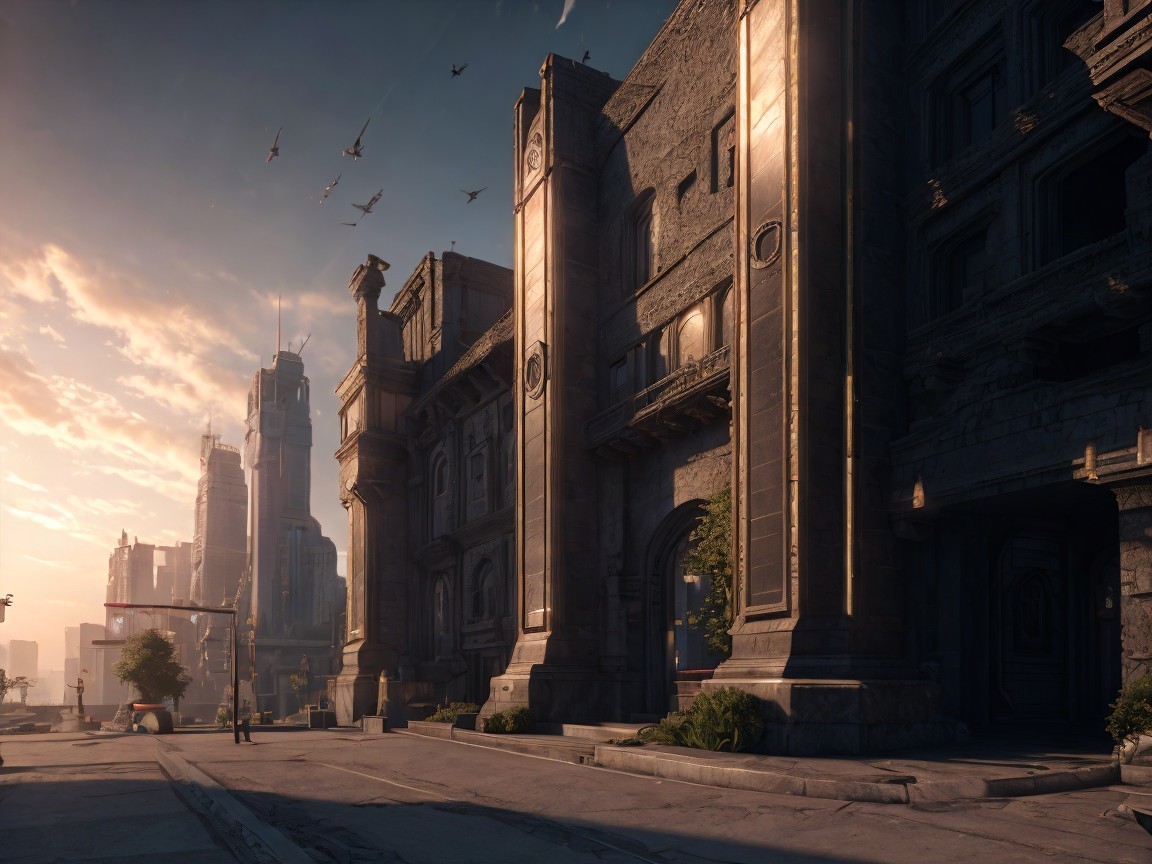 A majestic, ornate building with intricate architecture features tall spires and lush greenery, set against a picturesque sky at sunset, creating a serene and grand atmosphere.