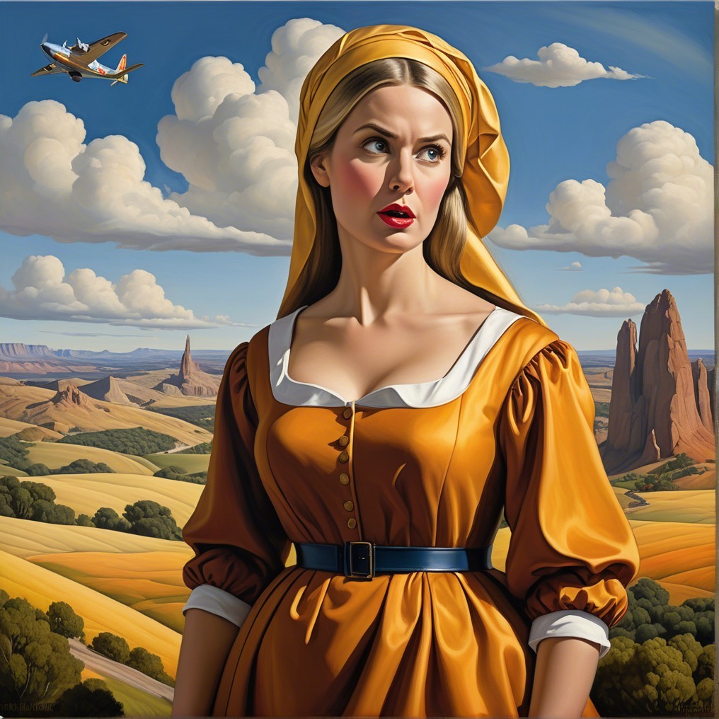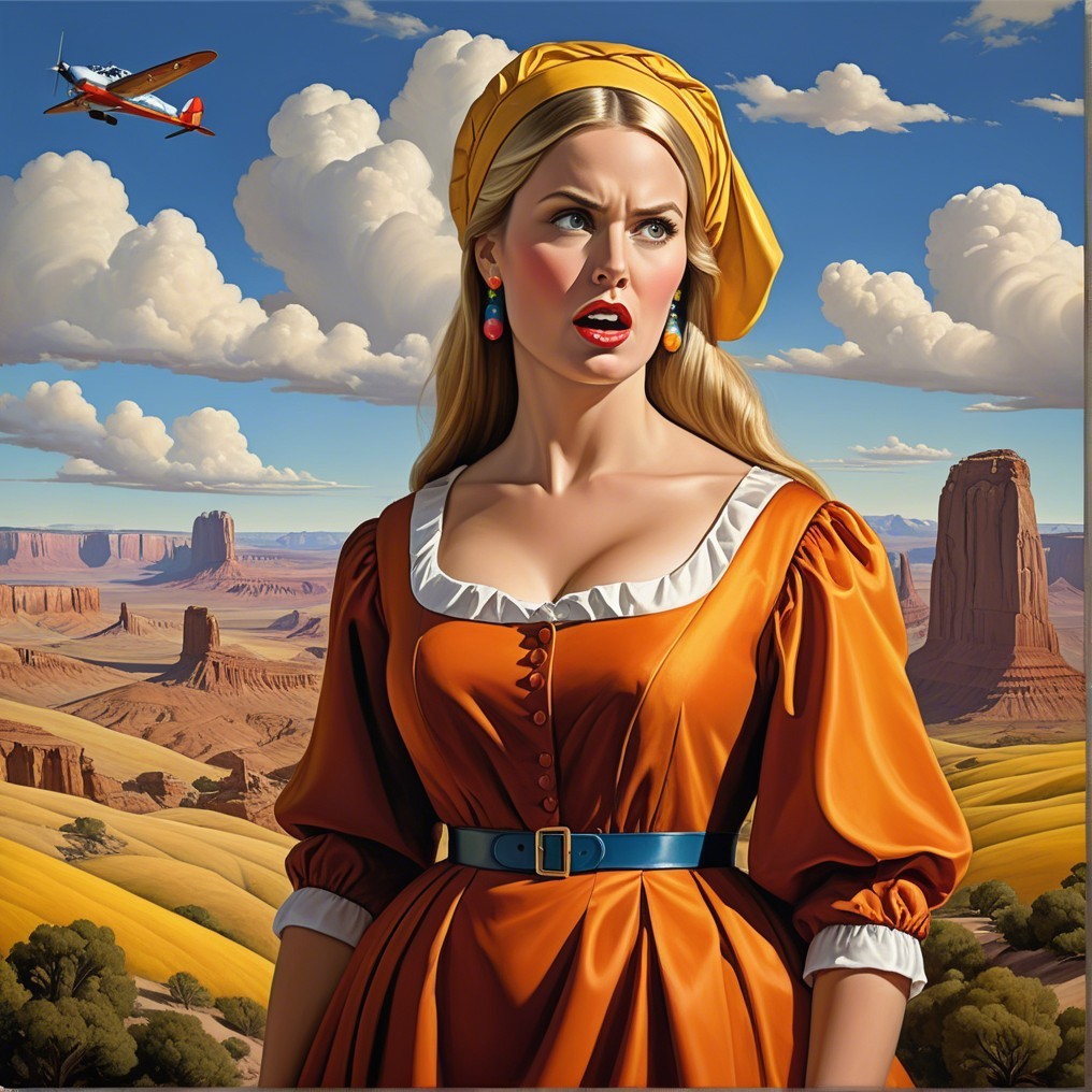 A woman in a vibrant orange dress stands against a stunning desert landscape with dramatic rock formations and blue skies, exuding a blend of elegance and natural beauty.