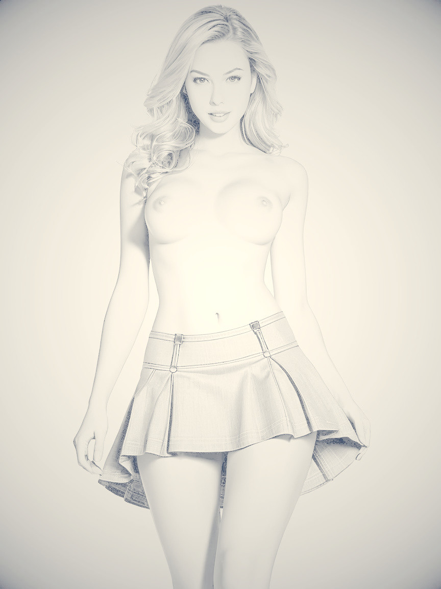 A stylish woman with wavy hair poses confidently. She wears a short skirt and has a sleek, modern look, emphasizing a blend of elegance and casual charm in a monochrome illustration.