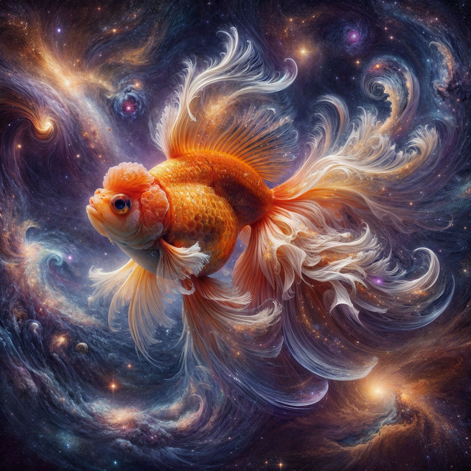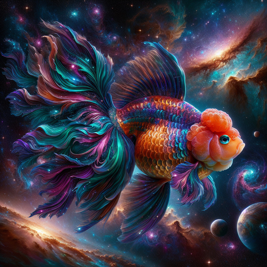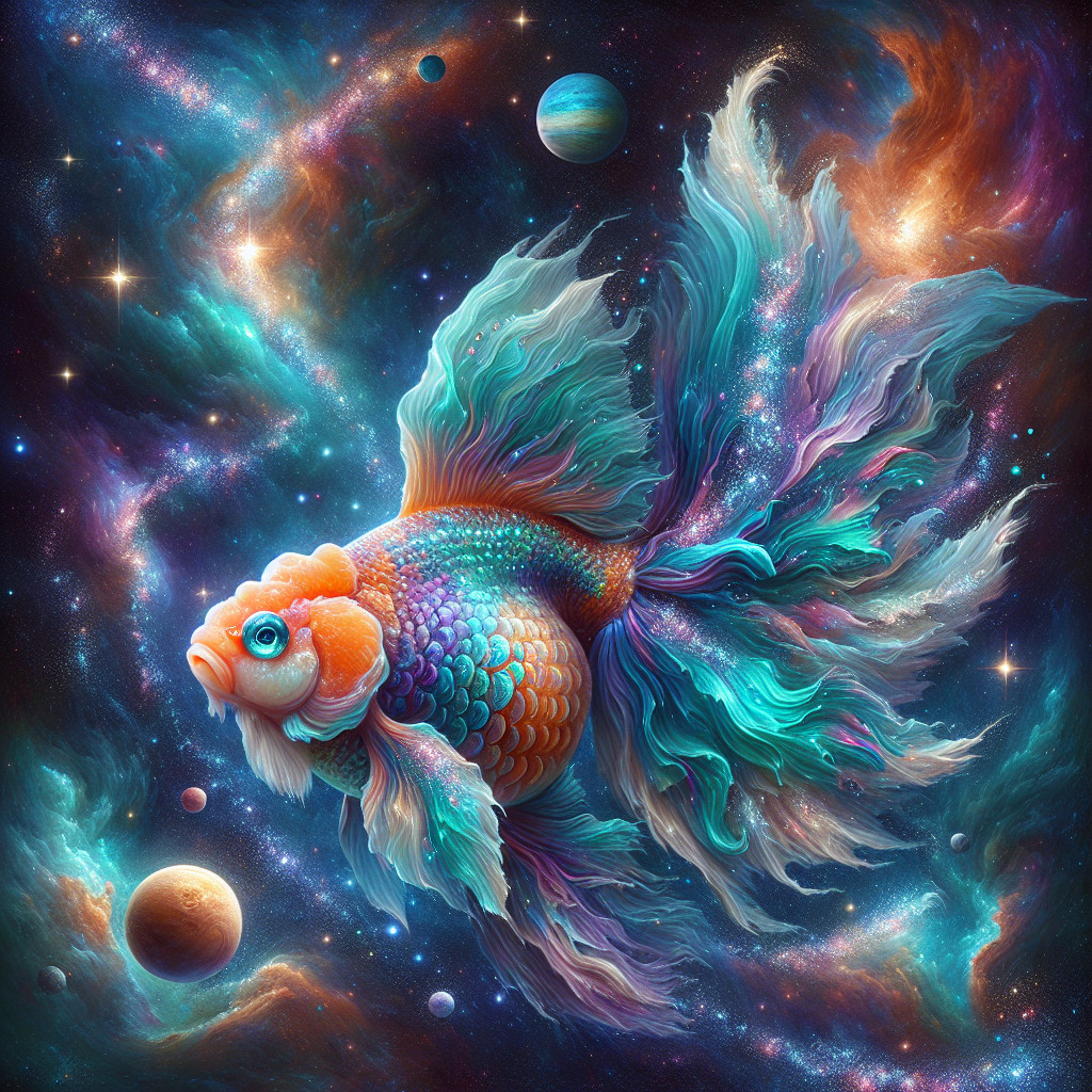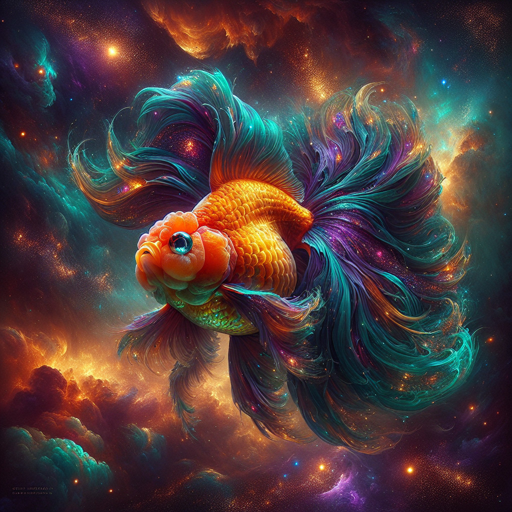 A vibrant goldfish swims gracefully through a cosmic scene, surrounded by swirling galaxies and colorful nebulae, creating a mesmerizing fusion of marine life and the universe.