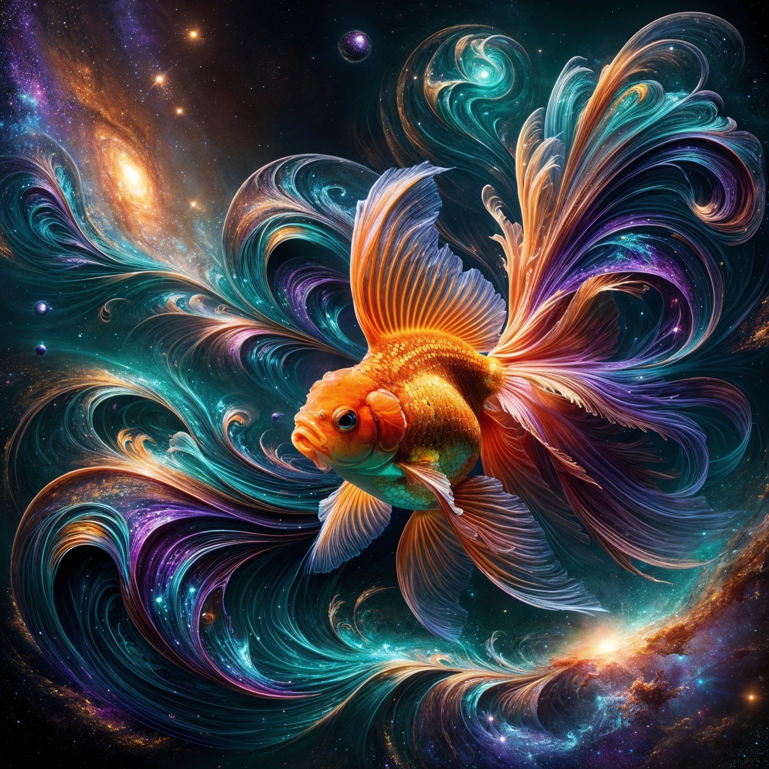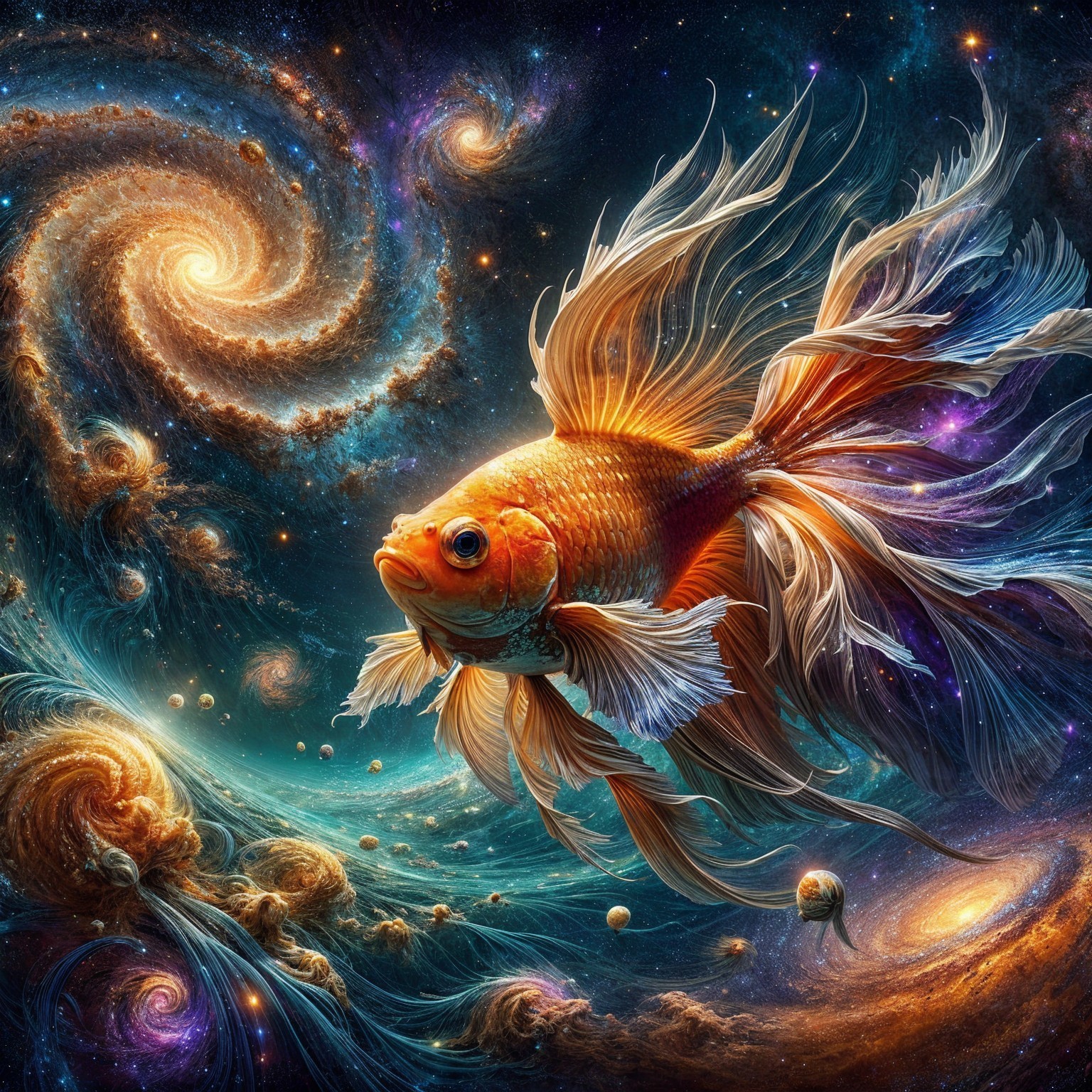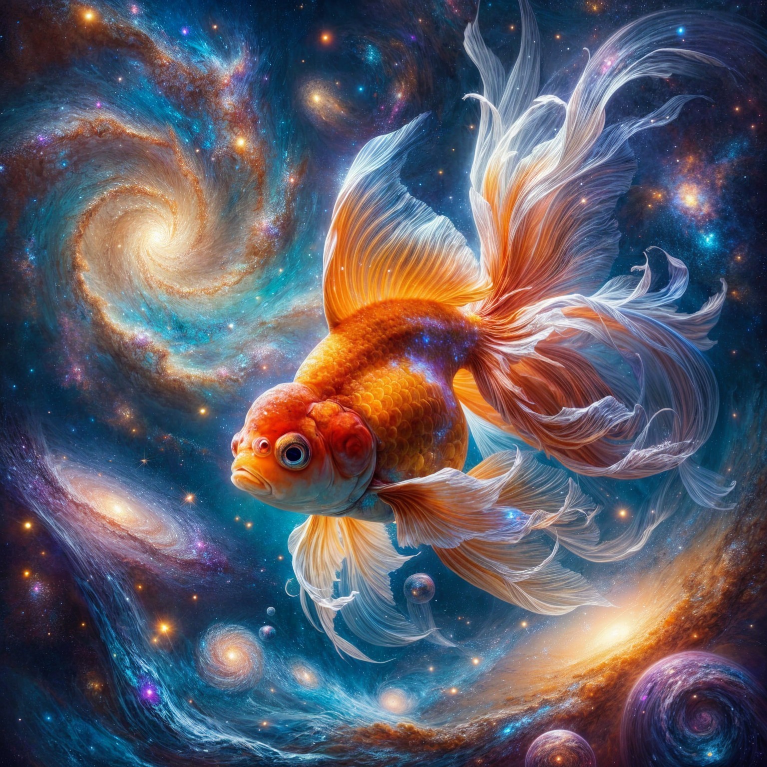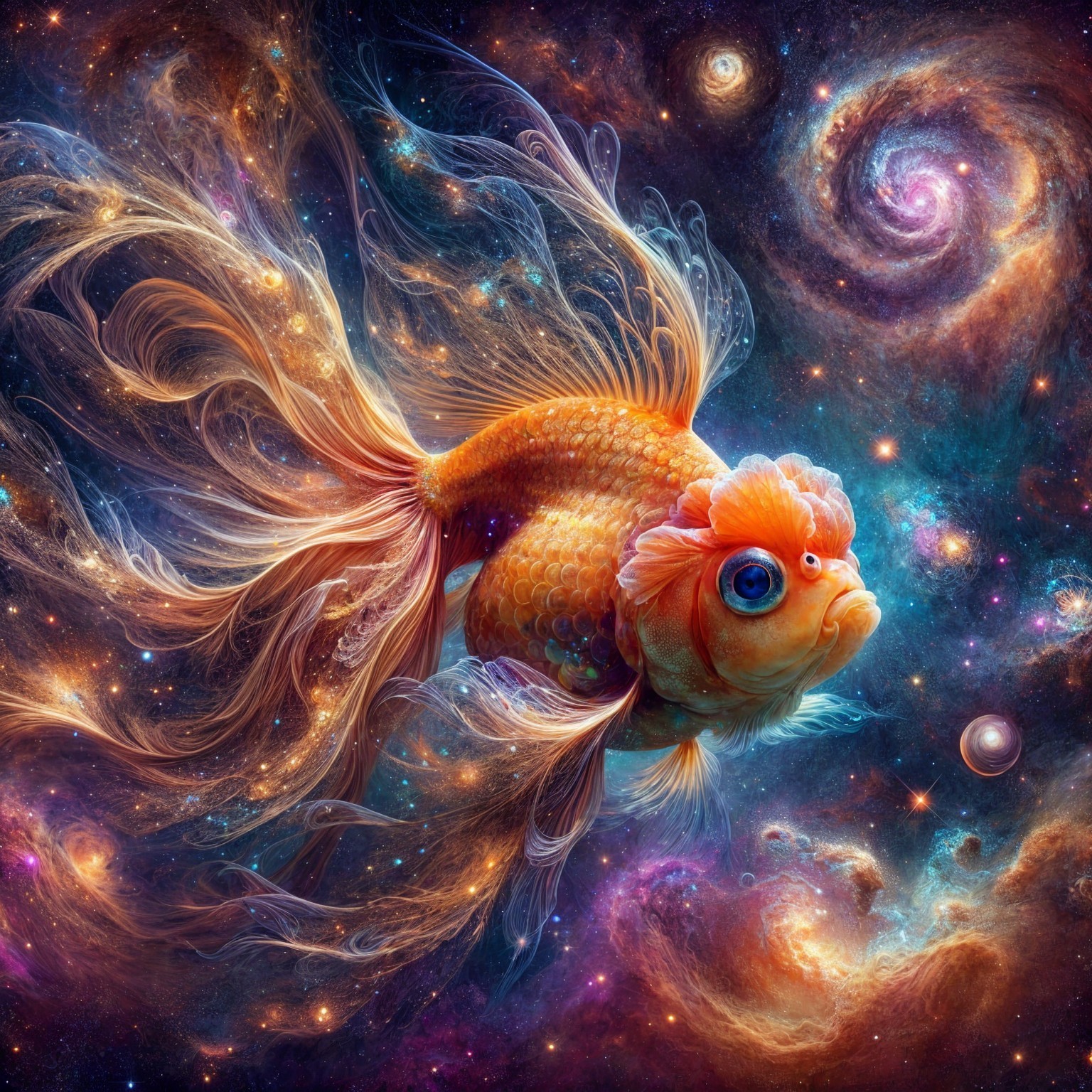 A vibrant goldfish swims gracefully through a cosmic scene, surrounded by swirling galaxies and colorful nebulae, creating a mesmerizing fusion of marine life and the universe.