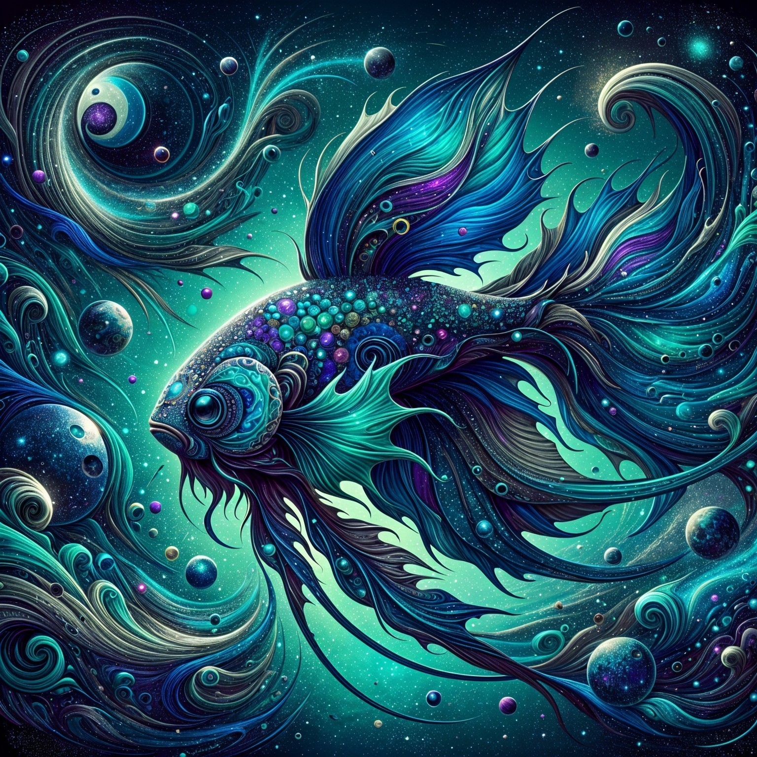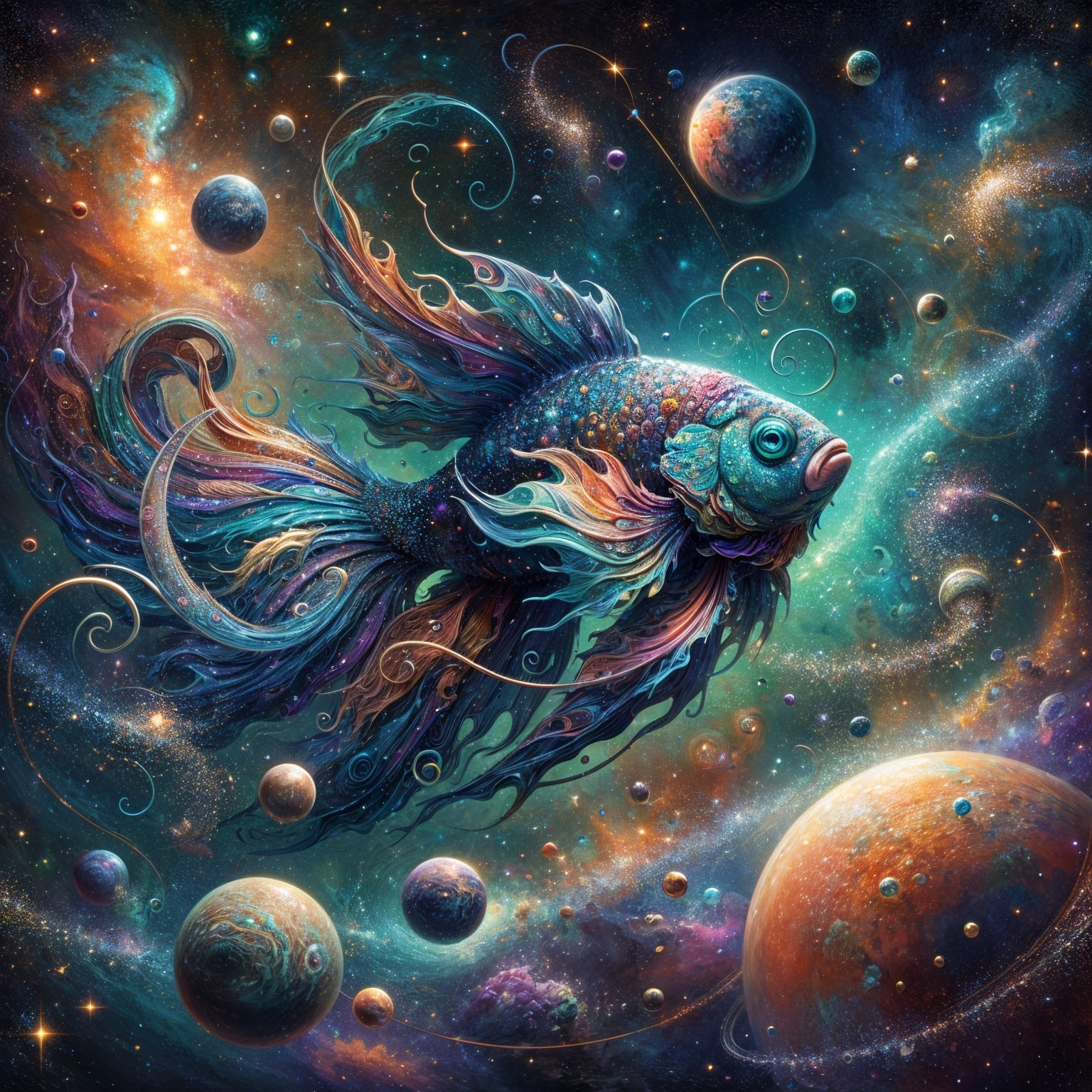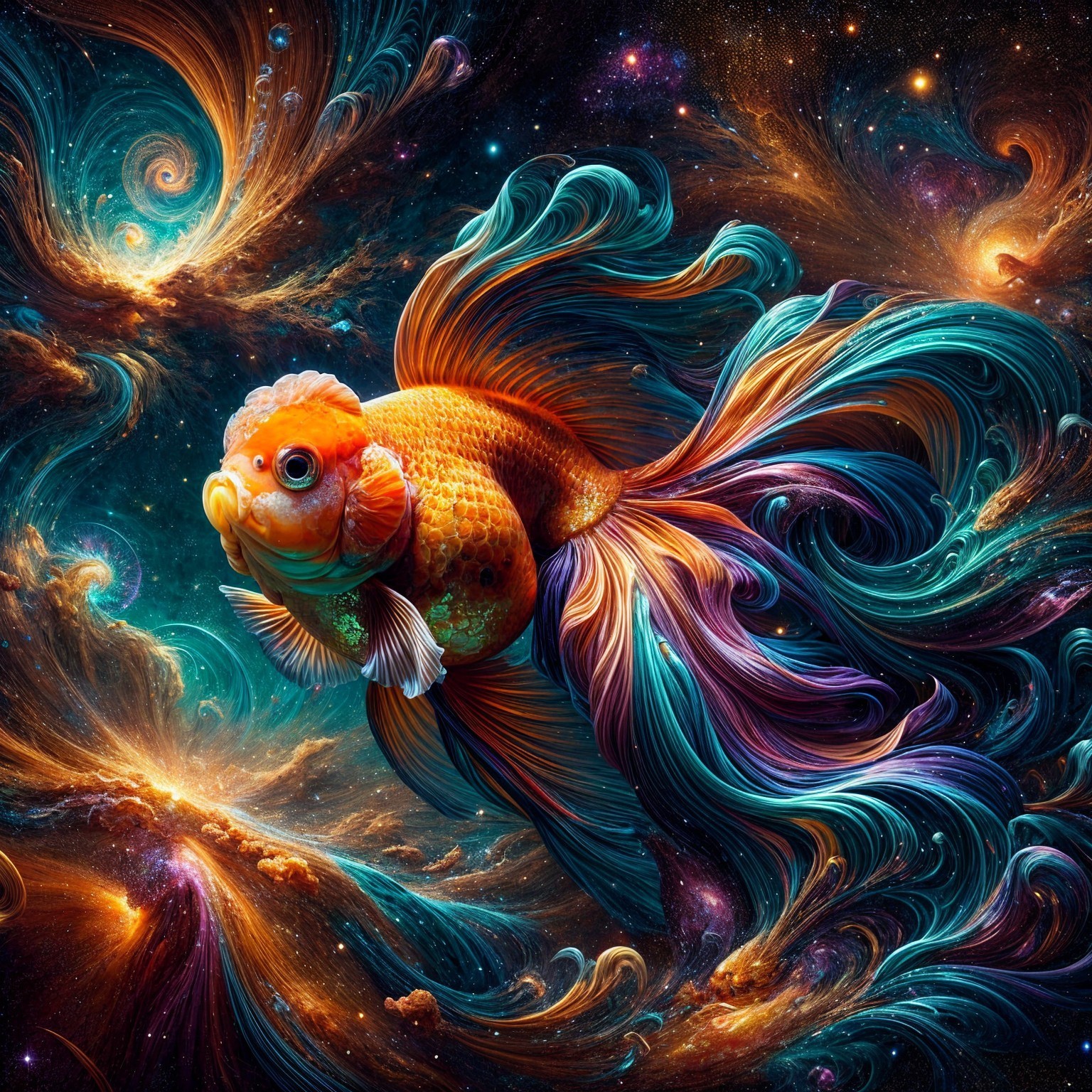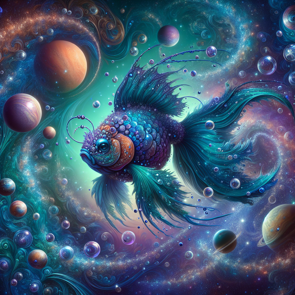 A vibrant goldfish swims gracefully through a cosmic scene, surrounded by swirling galaxies and colorful nebulae, creating a mesmerizing fusion of marine life and the universe.