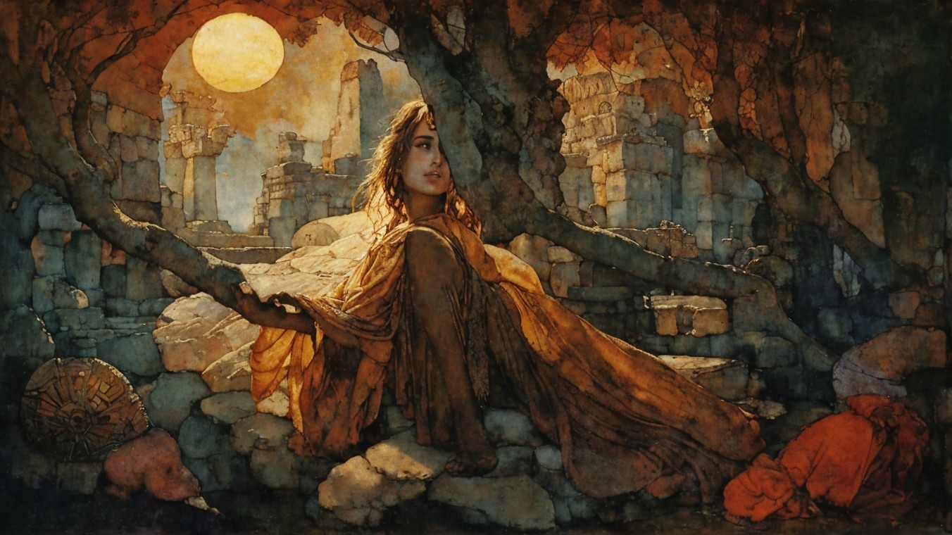 Ancient cities, ancient tales. Ancient spirits Beautiful exotic woman. Arthur Rackham Paul Klee Norman Rockwell anatomically correct Steve Hanks muted tones symmetrical face Ochre Big brown eyes Subdued palette wide open dark eyes Symmetrical eyes, nose and mouth moody, somber, desaturated colors Soft, somber, delicate Soft dappled lighting. Golden hour. Leonardo, Durer, Schiele, Degas, Mondrian - mixed media surreal Richard Burlet celestial Enki Bilal dynamic pose Esao Andrews enigmatic dreamy atmosphere susanne Jamie Heiden cosmic splendor Surreal dream In the darkness I dance