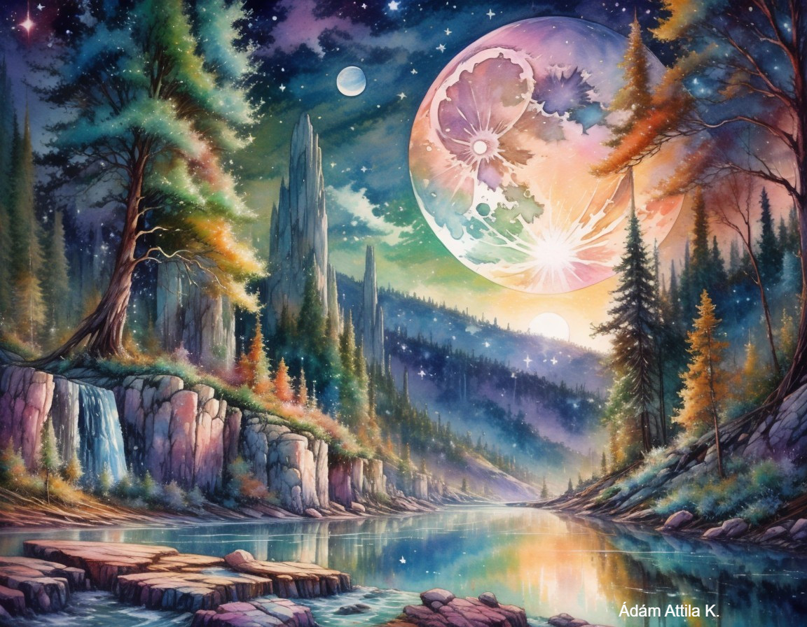 A fantasy landscape with a river, colorful trees, evening sky, full moon.