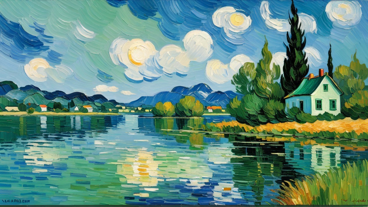 A vibrant oil painting in the style of Van Gogh depicts a peaceful lake scene. The brushstrokes are thick and impasto, creating a textured surface. The sky is a swirl of deep blues and light blues, with fluffy white and yellow clouds. The sun, represented by a yellow disc, peeks
