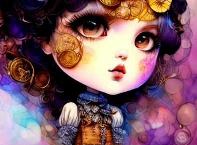 An artistic illustration of a girl with large eyes, colorful swirls, and flowers adorning her hair, exuding a whimsical, fantasy-like aura.