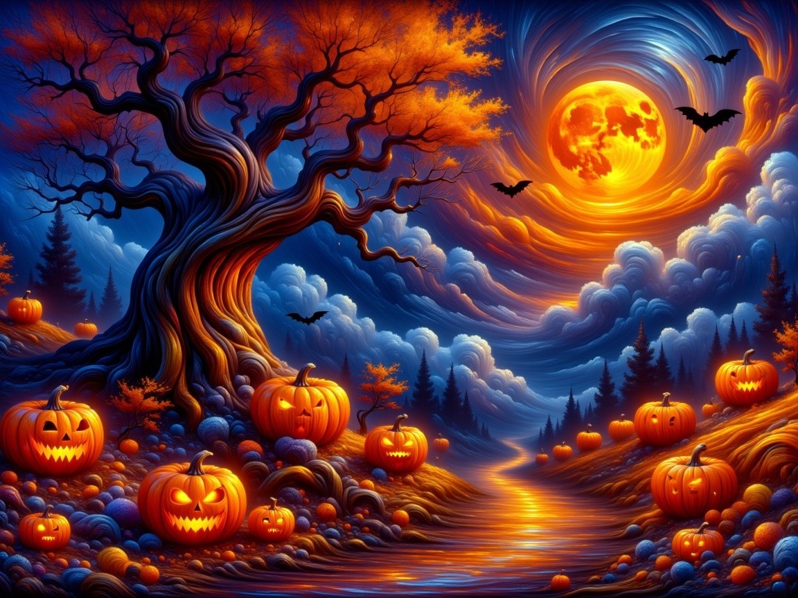 A vibrant autumn scene features a large, orange tree with cascading leaves, glowing pumpkins with carved faces, and a moonlit sky adorned with bats. A rustic fence complements the tranquil setting.