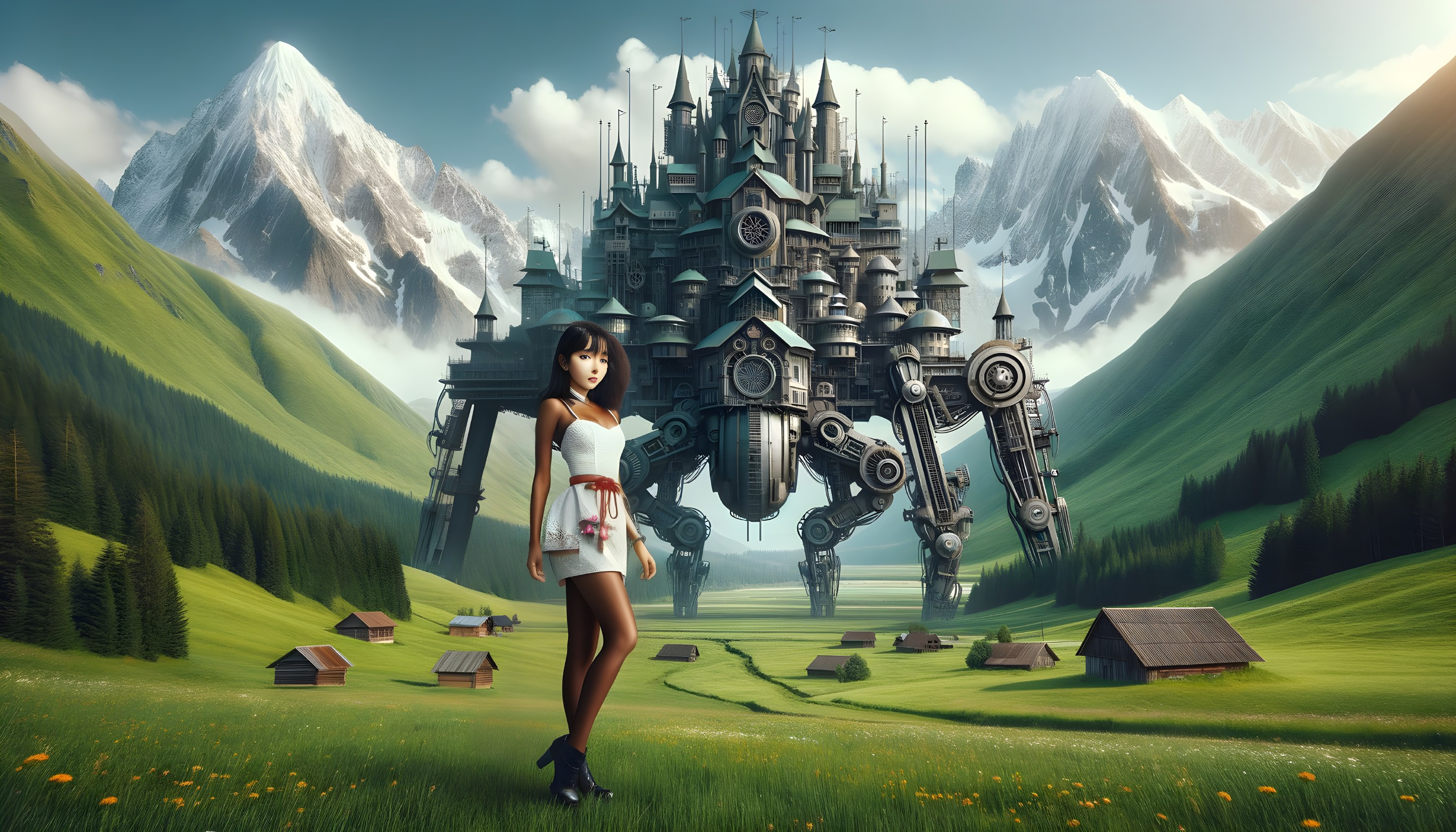 This was supposed to be a gorgeous young woman standing in front of Howl's Moving Castle from the movie made by Hayao Miyazaki. It's kinda of parody of that anime movie.