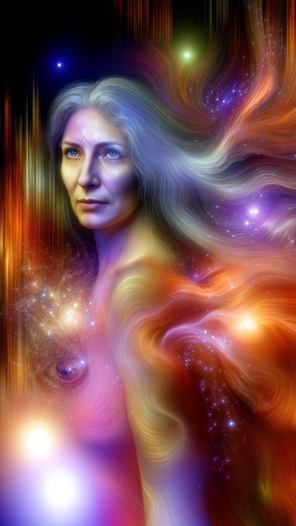 A young woman with flowing, colorful hair stands against a vibrant cosmic backdrop filled with planets and swirling nebulae, exuding a sense of wonder and mystery.