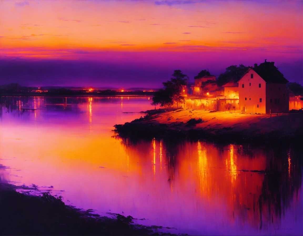 Prompt: "Oil on canvas, wide angle view, twlight landscape, glowing with vibrant hues, sky transitioning from warm orange to deep purple over a Tamisa river on eitghteen century. Perfect composition. By William Turner."