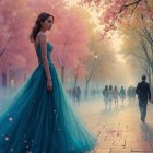 A serene scene featuring a woman in a flowing teal gown amidst blossoming trees, with butterflies fluttering around her. Mystical figures and reflections enhance the enchanting atmosphere.