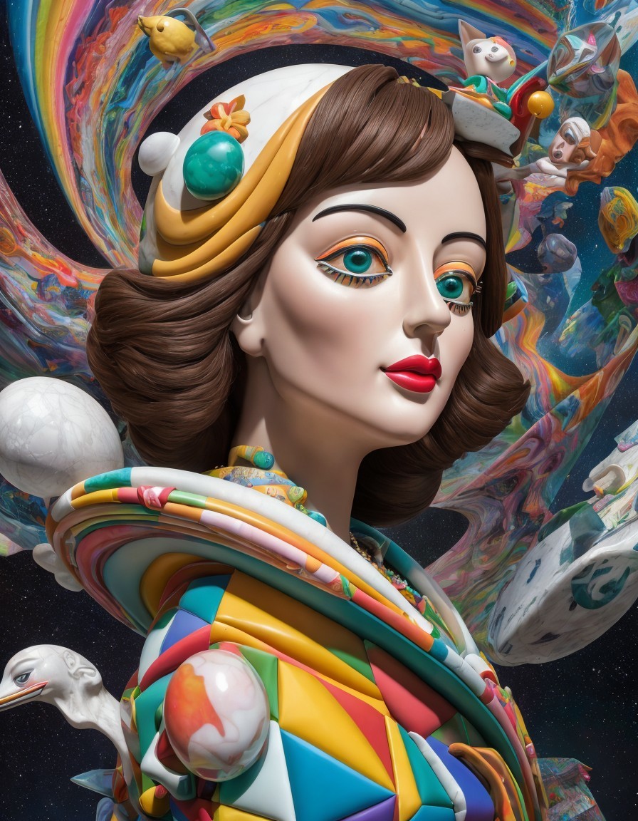 A stylized portrait of a woman with a cosmic background, featuring surreal elements and vibrant colors.