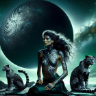 A mystical scene features a serene woman with intricate body art, seated between two majestic leopards. An enigmatic planet looms in the background, surrounded by swirling cosmic colors.