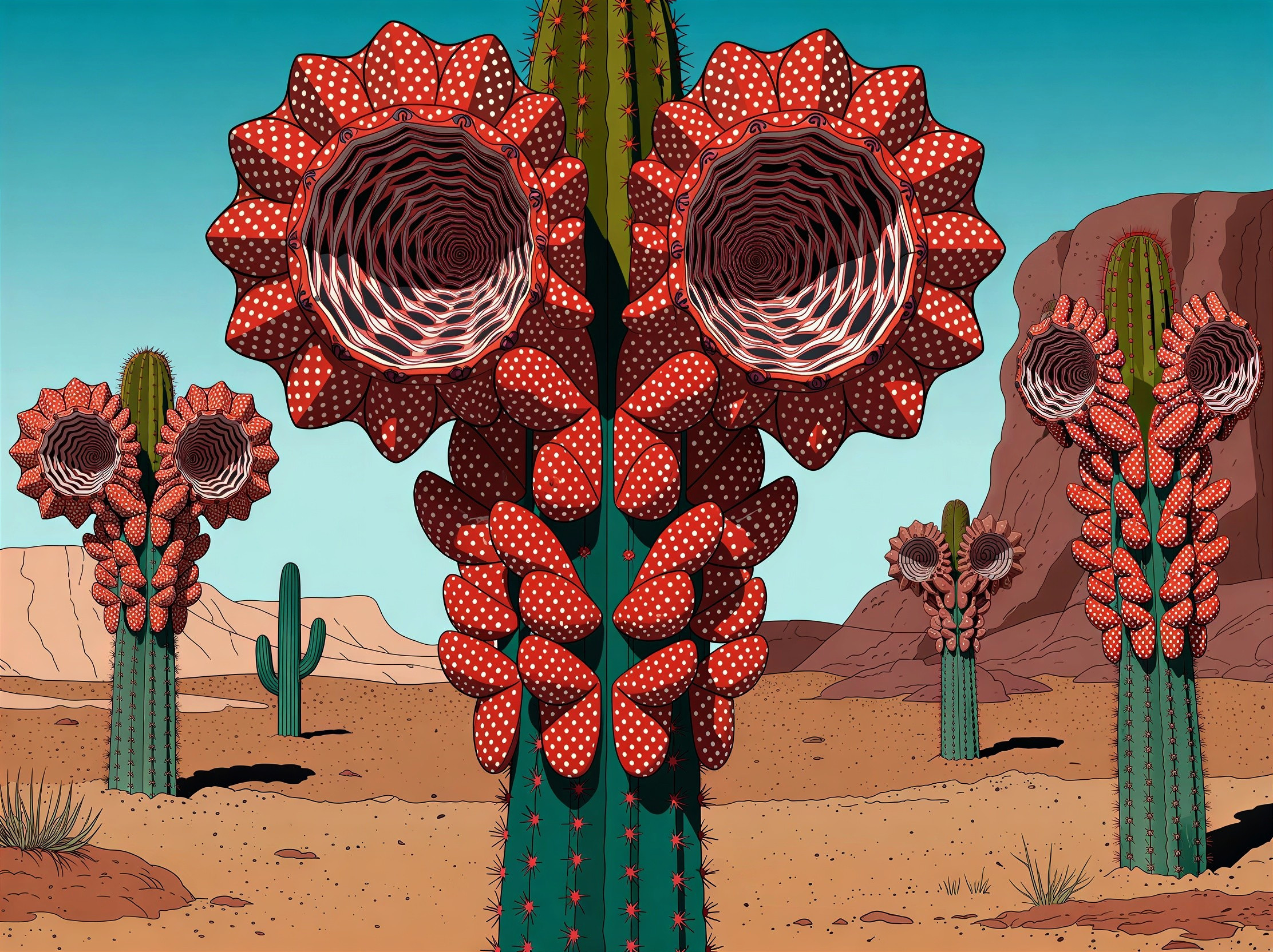 A vibrant artwork featuring whimsical, deconstructed cacti with mantissa-like heads, adorned with red and white dots, reminiscent of 1960s abstract expressionism, blending playful shapes and colors.