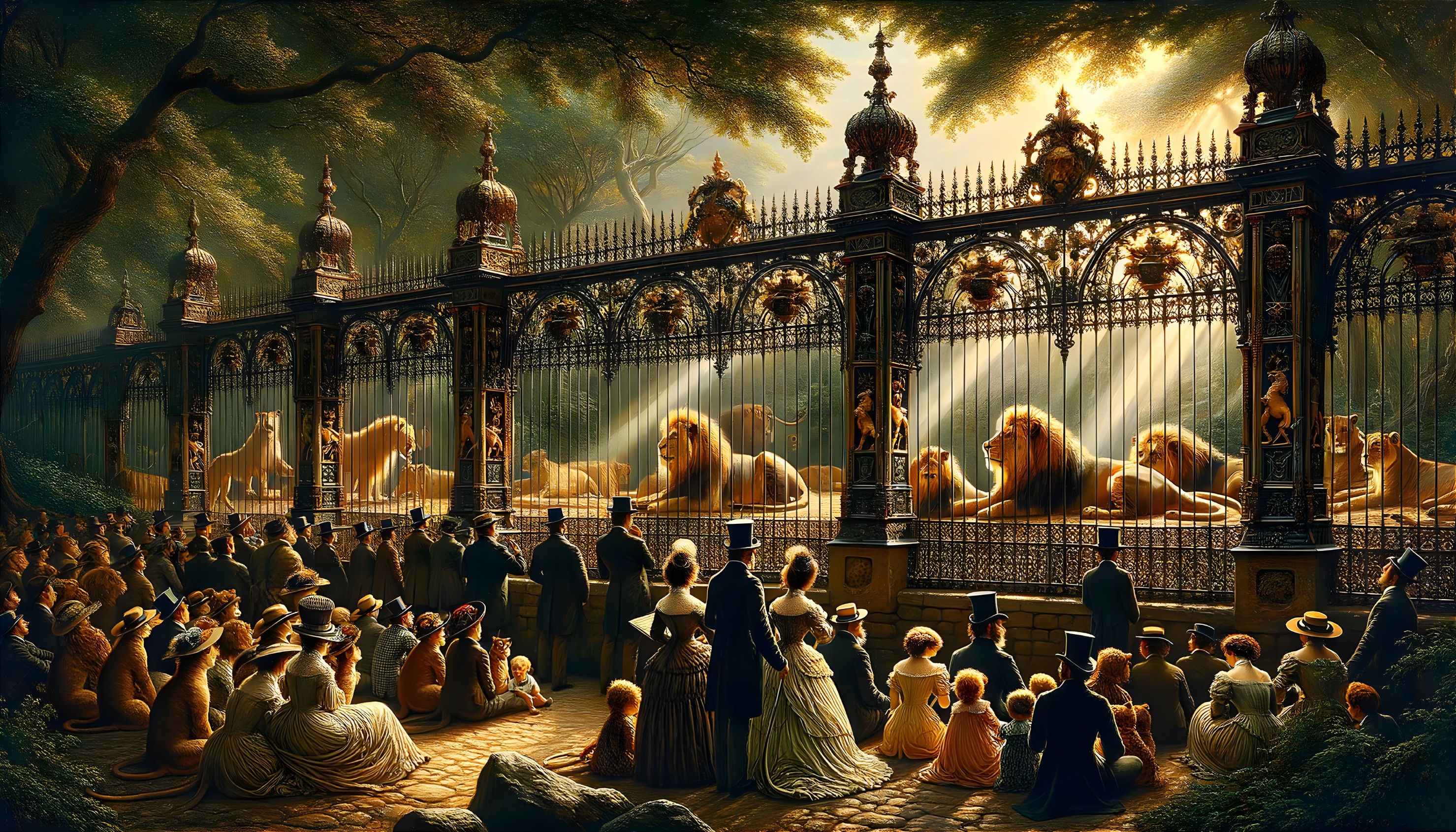 A detailed oil painting of a Victorian zoo with a focus on a lion enclosure. The scene includes elegant Victorian spectators, lush greenery, ornate wrought iron fence, and majestic lions. The artwork captures a lively and engaging atmosphere with intricate details and rich colors, showcasing the essence of a Victorian zoo visit.