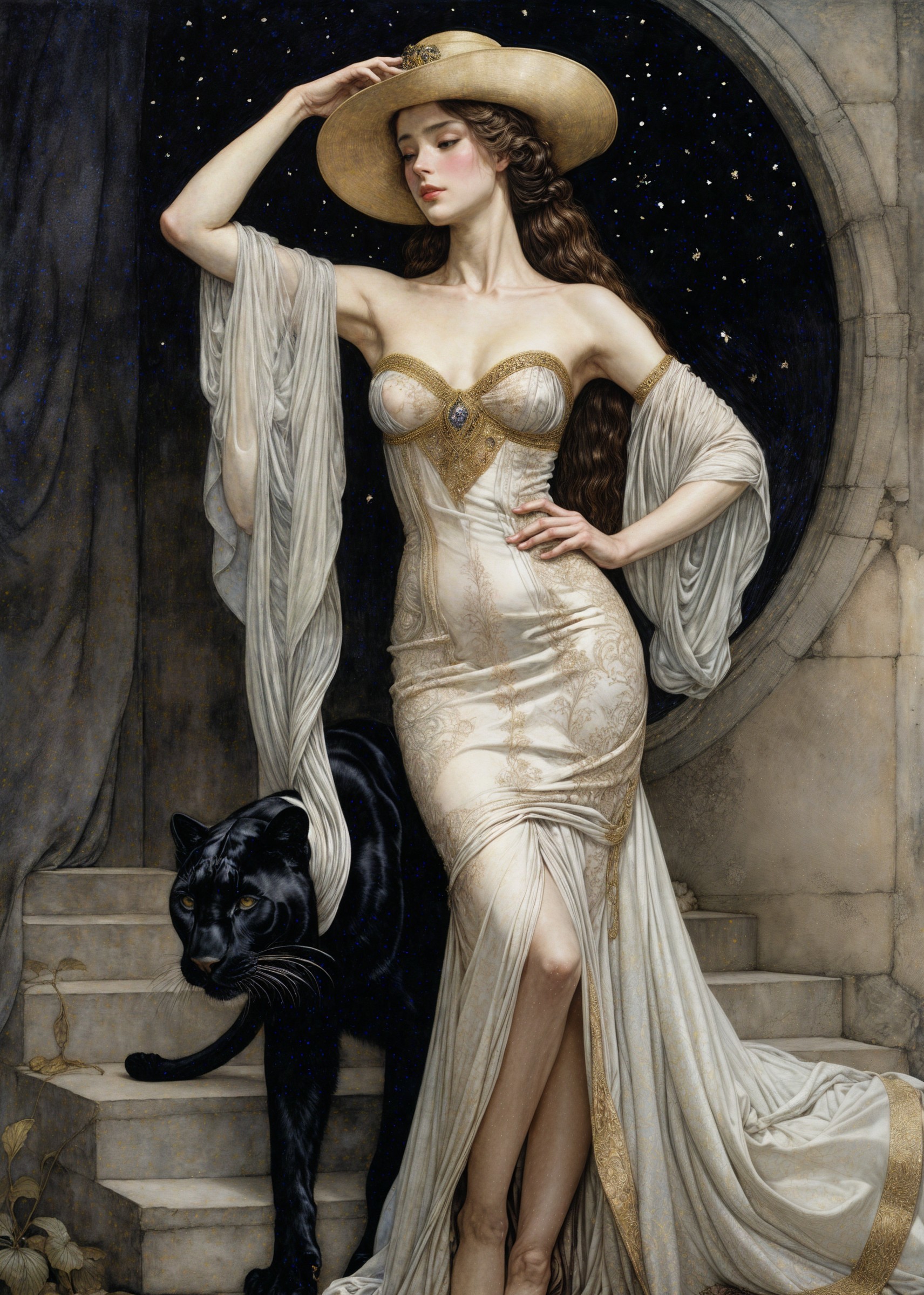 A woman in an elegant, flowing gown stands confidently beside a black panther. She wears a wide-brimmed hat, adorned with jewels, set against a backdrop of lush greenery and intricate architecture.