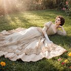 A serene woman in an elegant gown lies in a sunlit meadow, surrounded by vibrant flowers. Her floral crown and delicate dress enhance the tranquil beauty of the idyllic scene. (The base image was created with Raphael app)