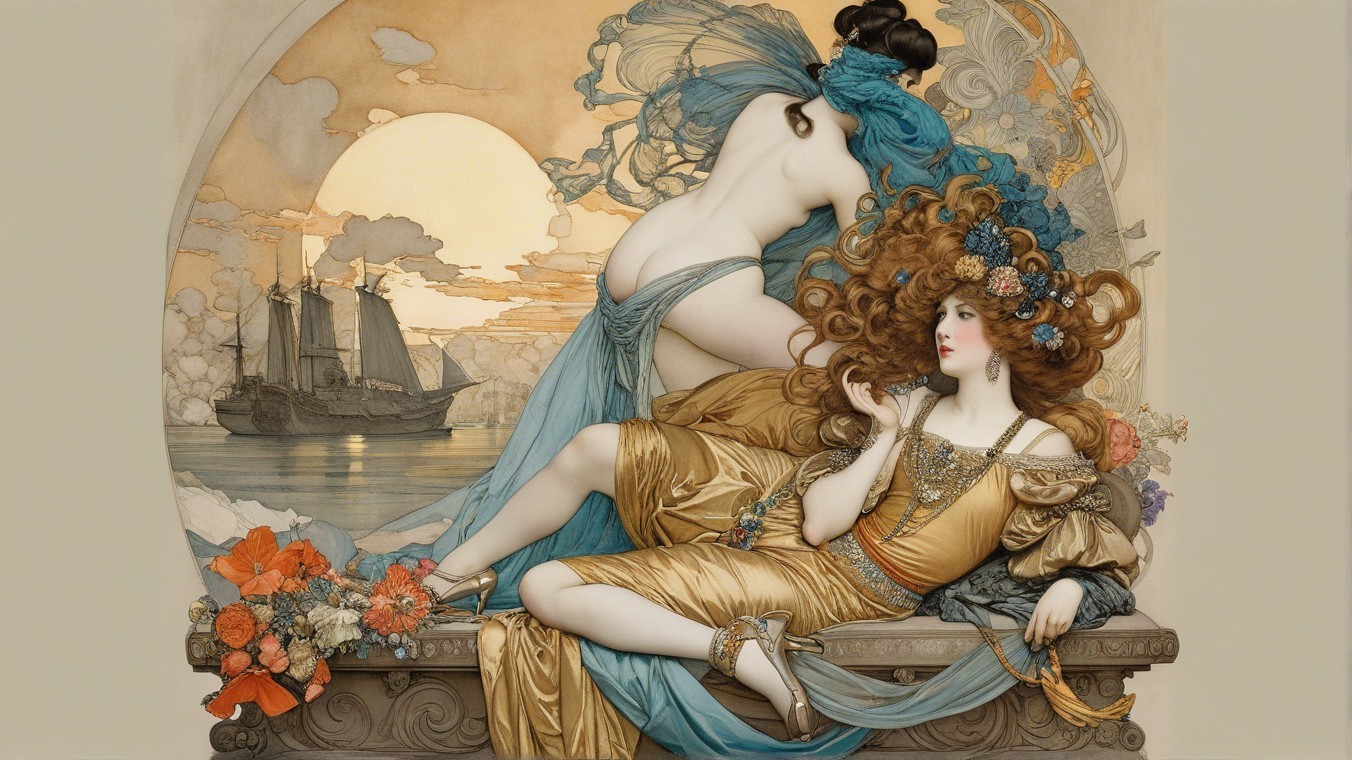 The image features two elegantly dressed women, one adult and one child, in ornate attire with intricate patterns. They are surrounded by a serene landscape, exuding grace and beauty.