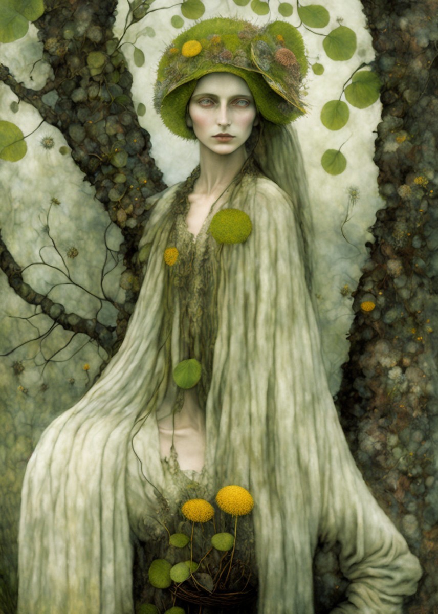 Beautiful woman with a dandelion hat, portrait in sienna, patina of ancient stone with moss, art brut, moody, somber, desaturated colors, in the style of Paul Klee, Arthur Rackham