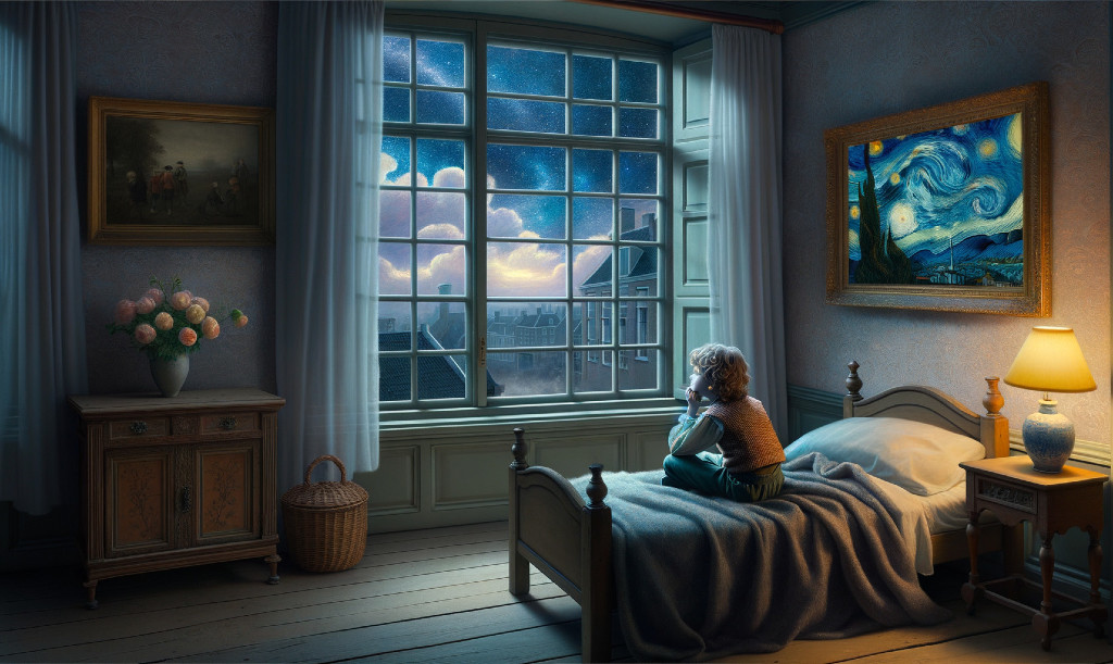 Daydreamer: A thoughtful child gazing out a window, combining Vermeer's soft lighting and detailed realism with Van Gogh's swirling starry night sky outside, depicting a fusion of reality and imagination.