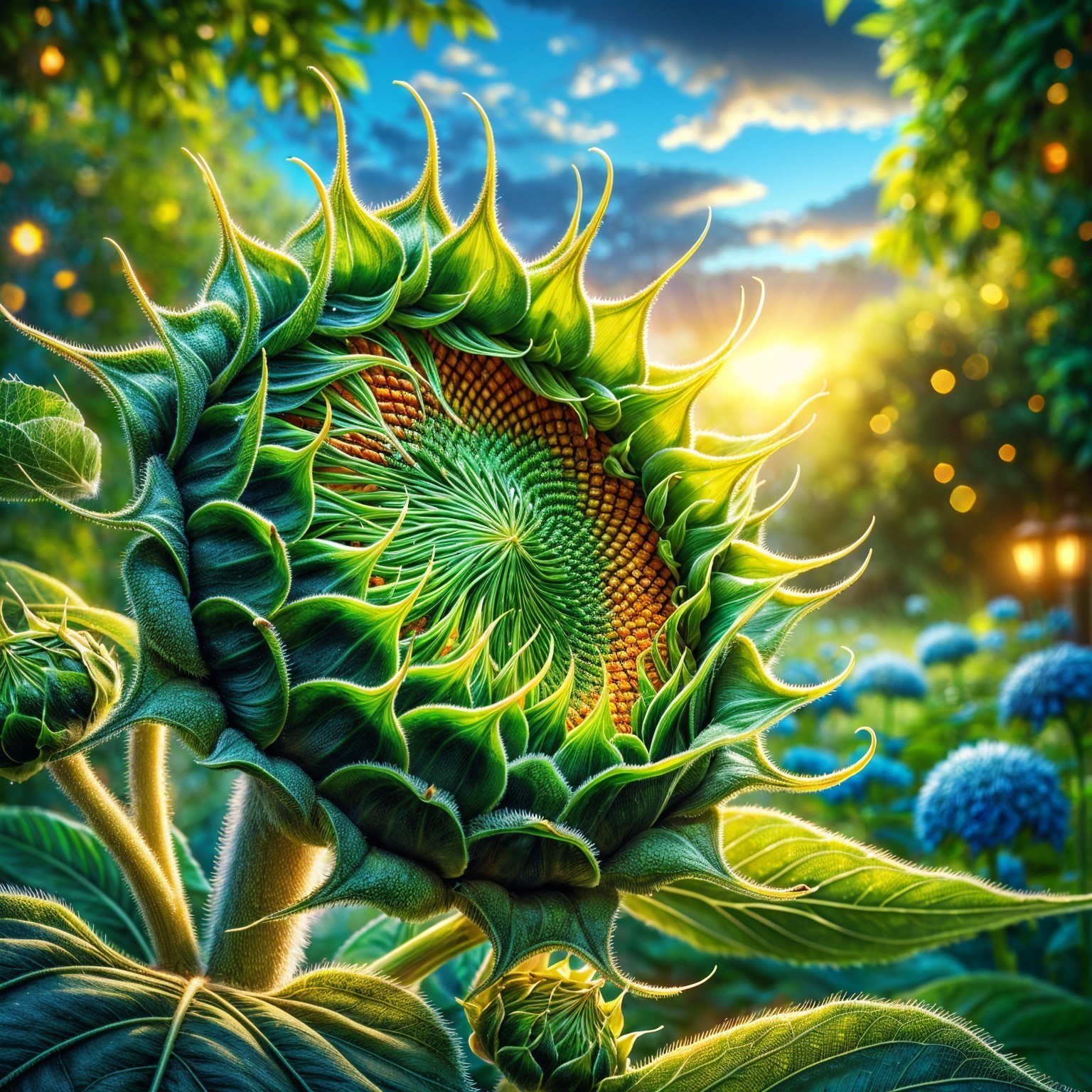 A vibrant sunflower bud emerges amidst a lush, colorful garden, bathed in warm sunlight. Its intricate petals and leaves radiate energy, creating a mesmerizing, enchanting atmosphere.