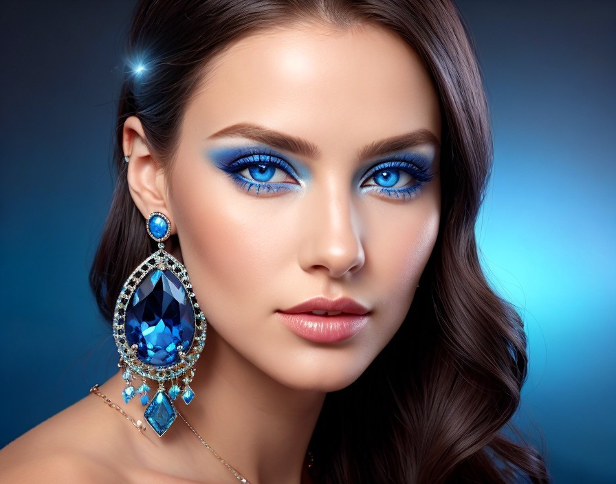 A woman with striking blue eyes, matching makeup, and elegant sapphire jewelry against a blue background.