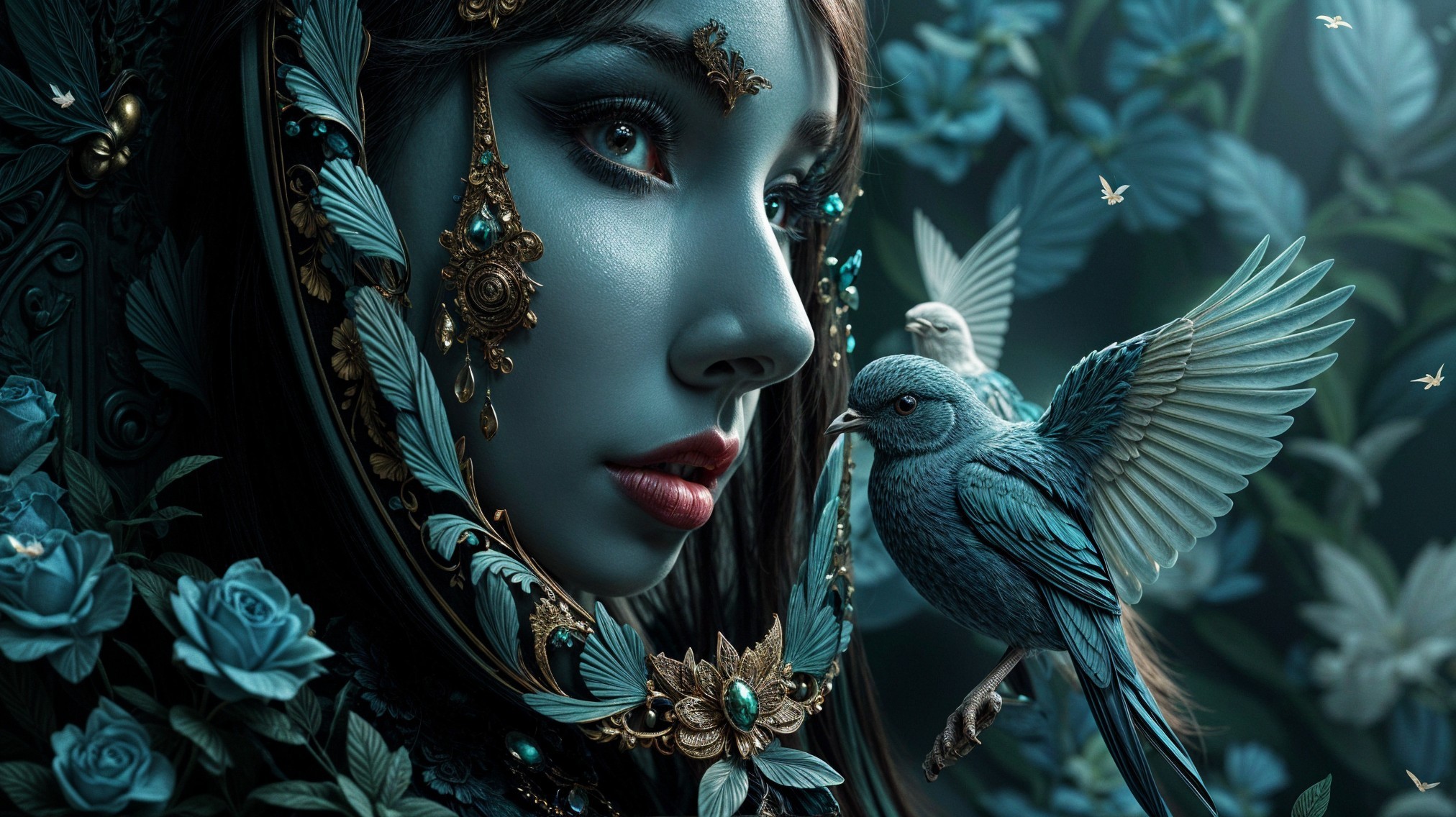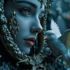 Close-Up Portrait of a Woman with Green Eyes and Bird