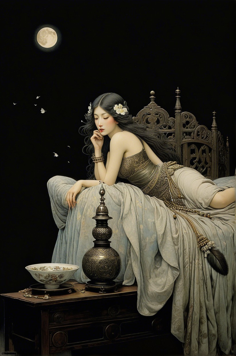 A serene woman in a flowing gown sits in contemplation, holding a delicate owl. The moonlight bathes her in a soft glow, while ornate objects and stars surround her in quiet elegance.