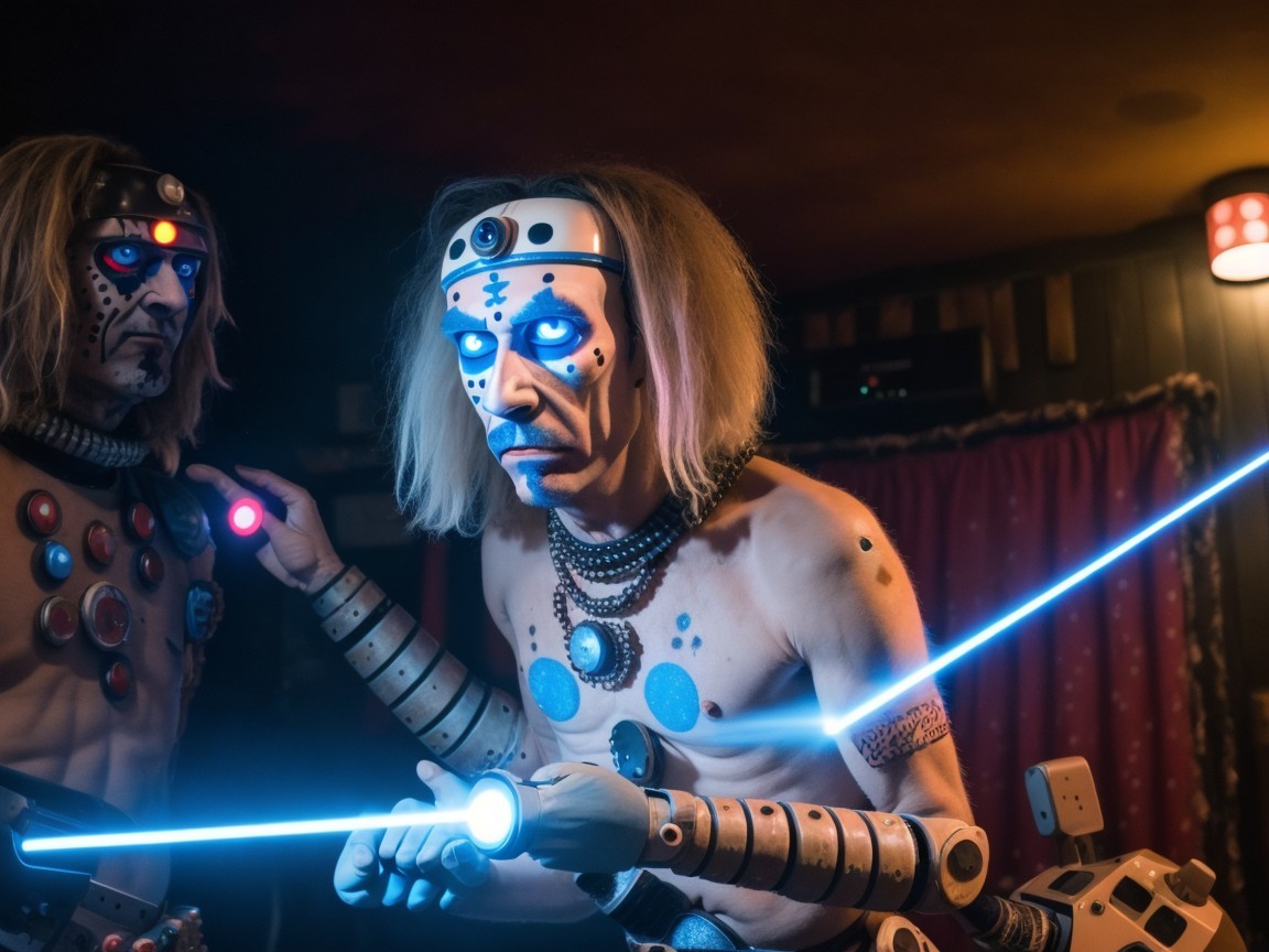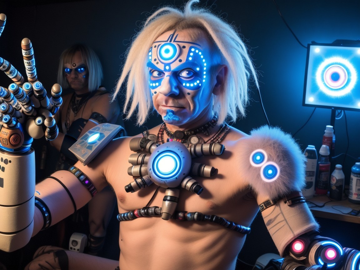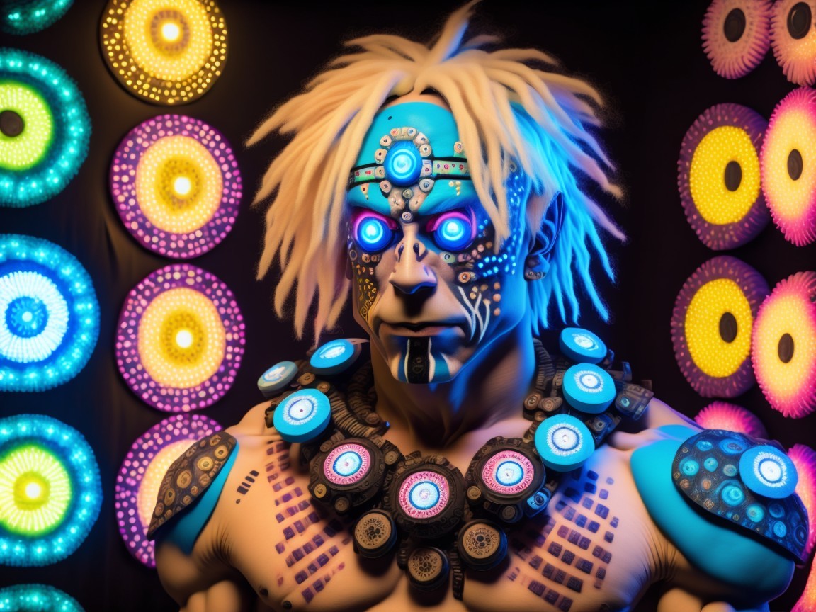 A vibrant, stylized figure with bright blue hair stands against a colorful backdrop. Its body is adorned with intricate patterns and glowing circles, creating a striking, futuristic appearance.