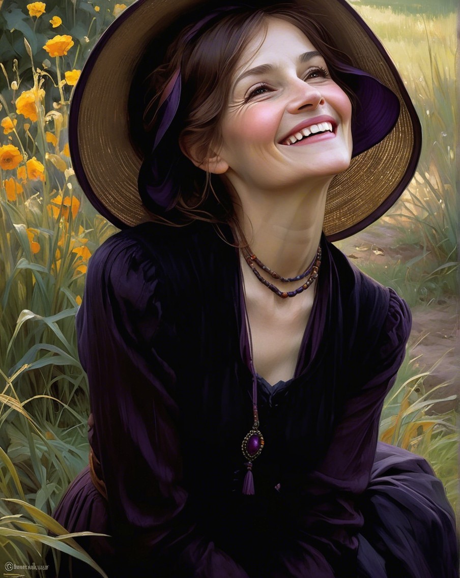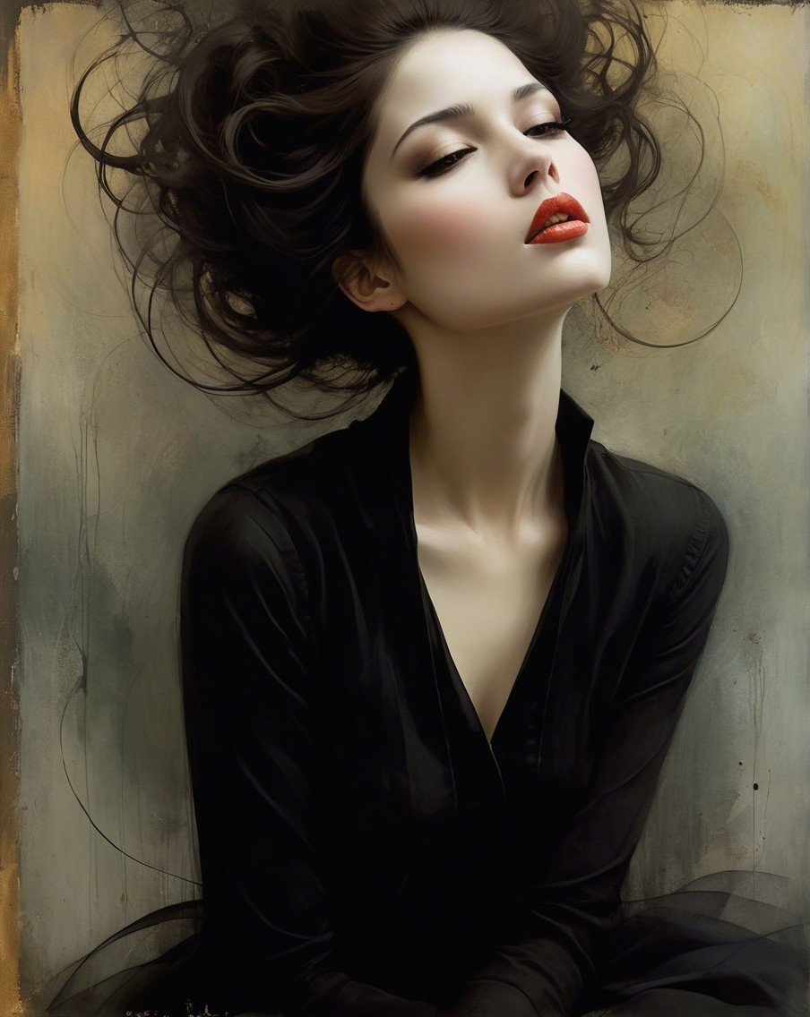 A serene portrait of a woman with flowing dark hair, wearing a large, elegant hat adorned with a delicate flower. Her soft gaze and subtle makeup evoke a sense of beauty and sophistication.