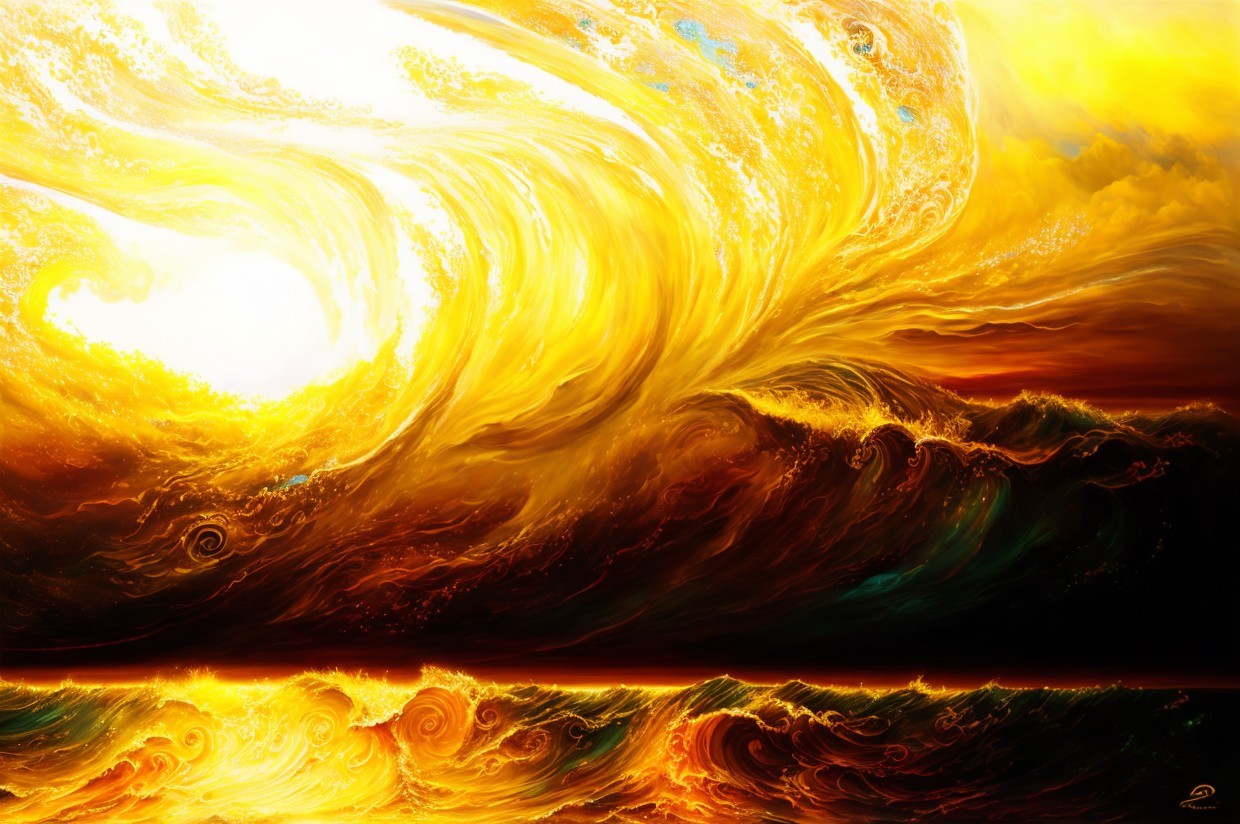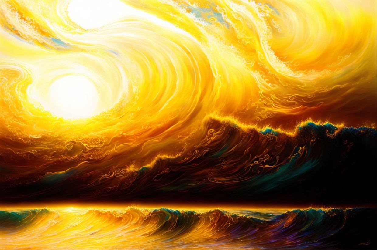 A stylized artistic image of a vibrant, swirling sunset over waves, with a warm color palette and a fluid, dream-like quality.